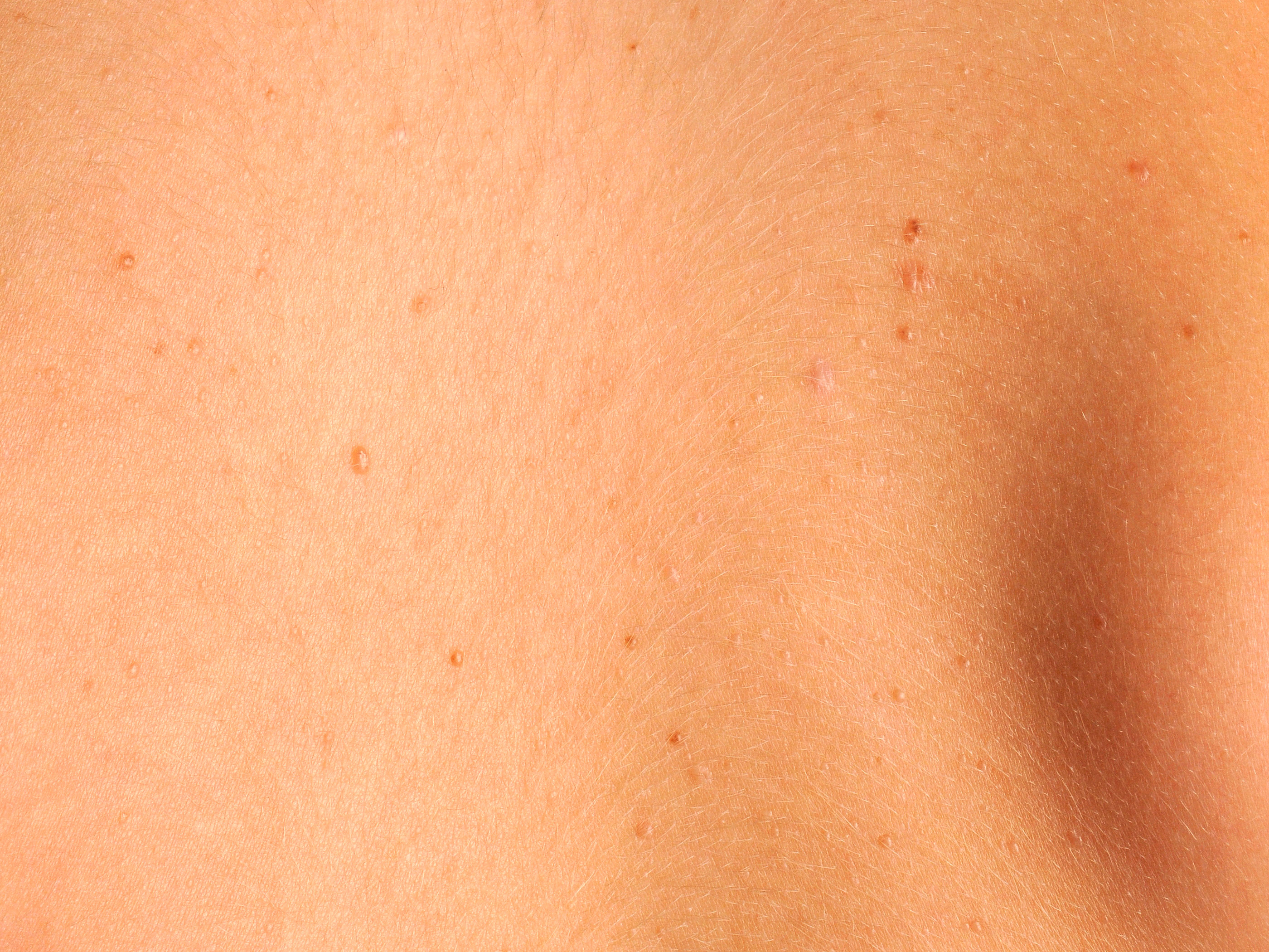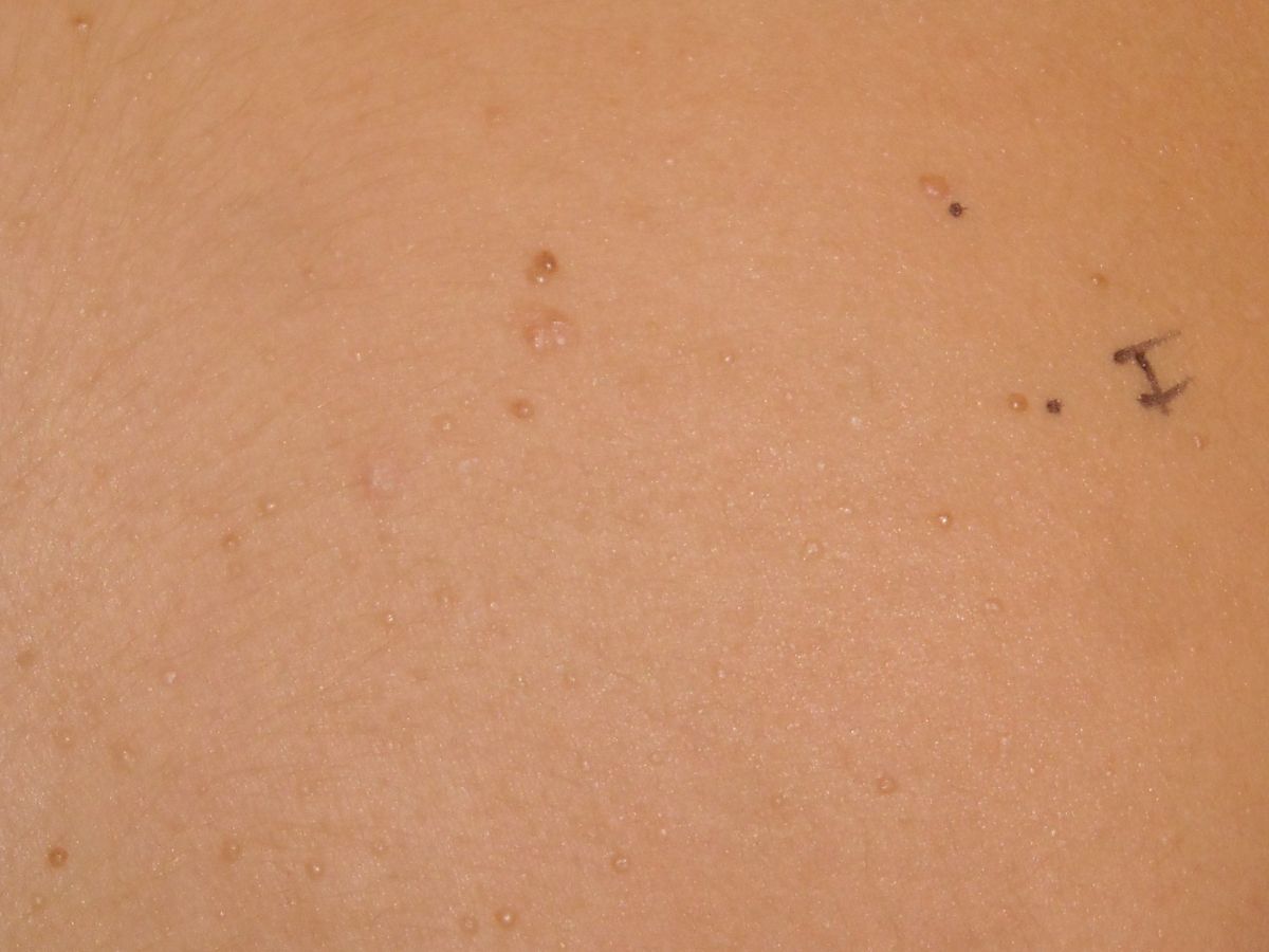 (1-2 mm) gepigmenteerde papeltjes, lijkend op naevi, vooral op zon-geexposeerde