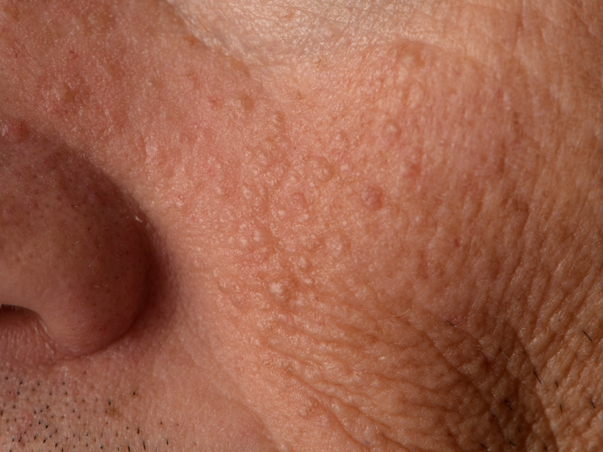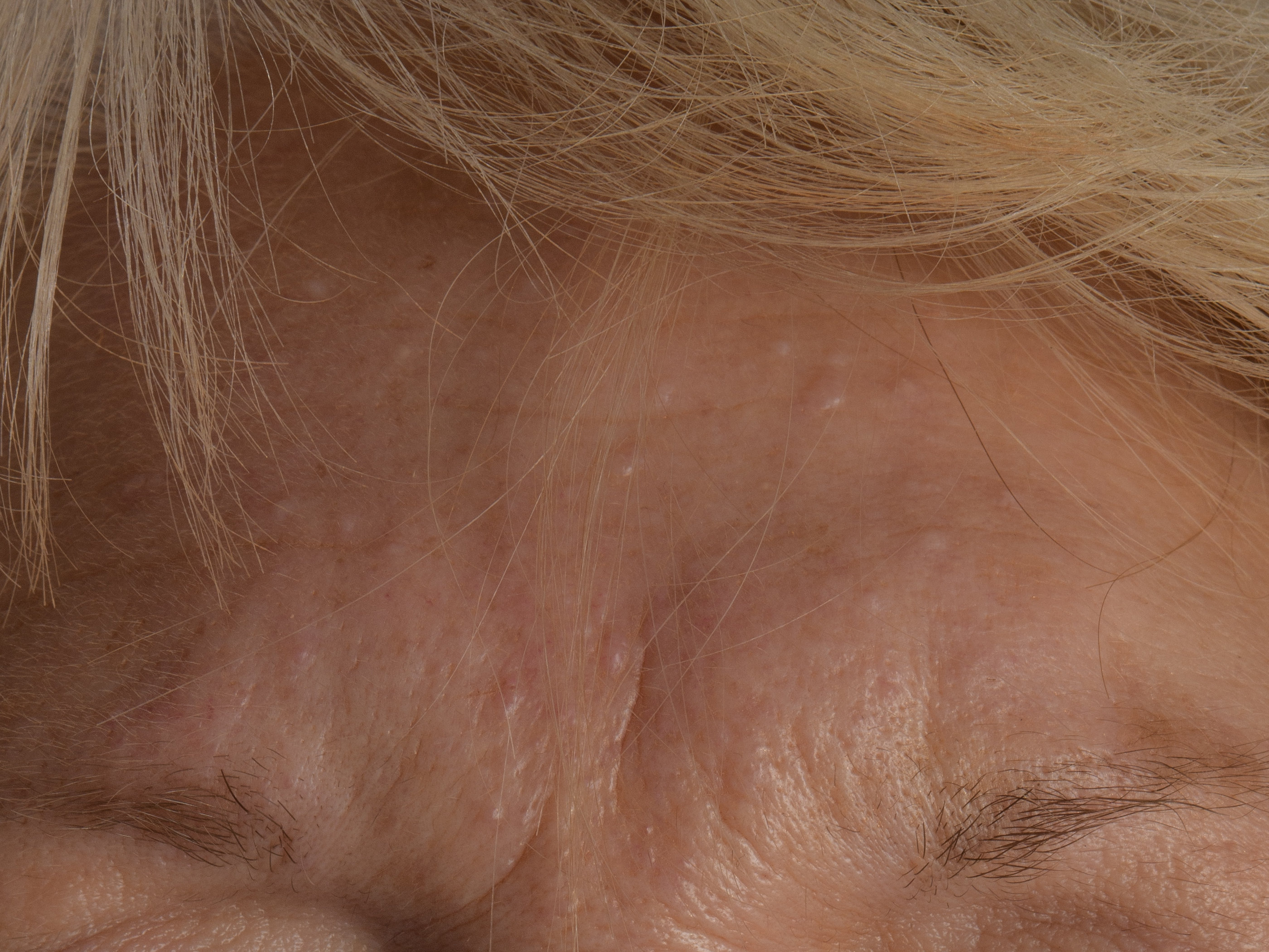 huidkleurige papeltjes ontstaan op het hoofd (behaarde hoofd, voorhoofd, gelaat),