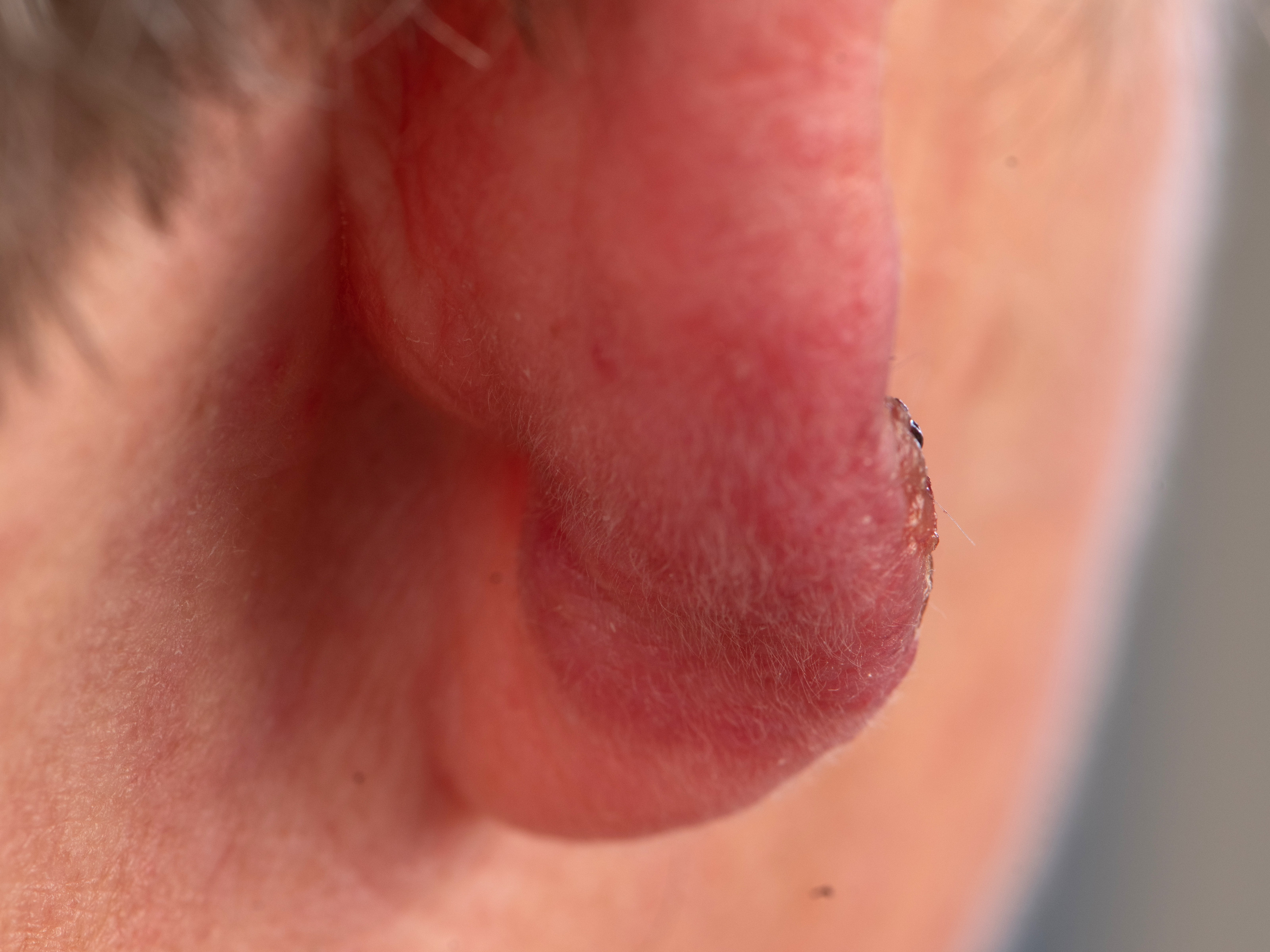 tot enkele cm grote pijnloze nodus of plaque, vooral op oorlel en helix bij