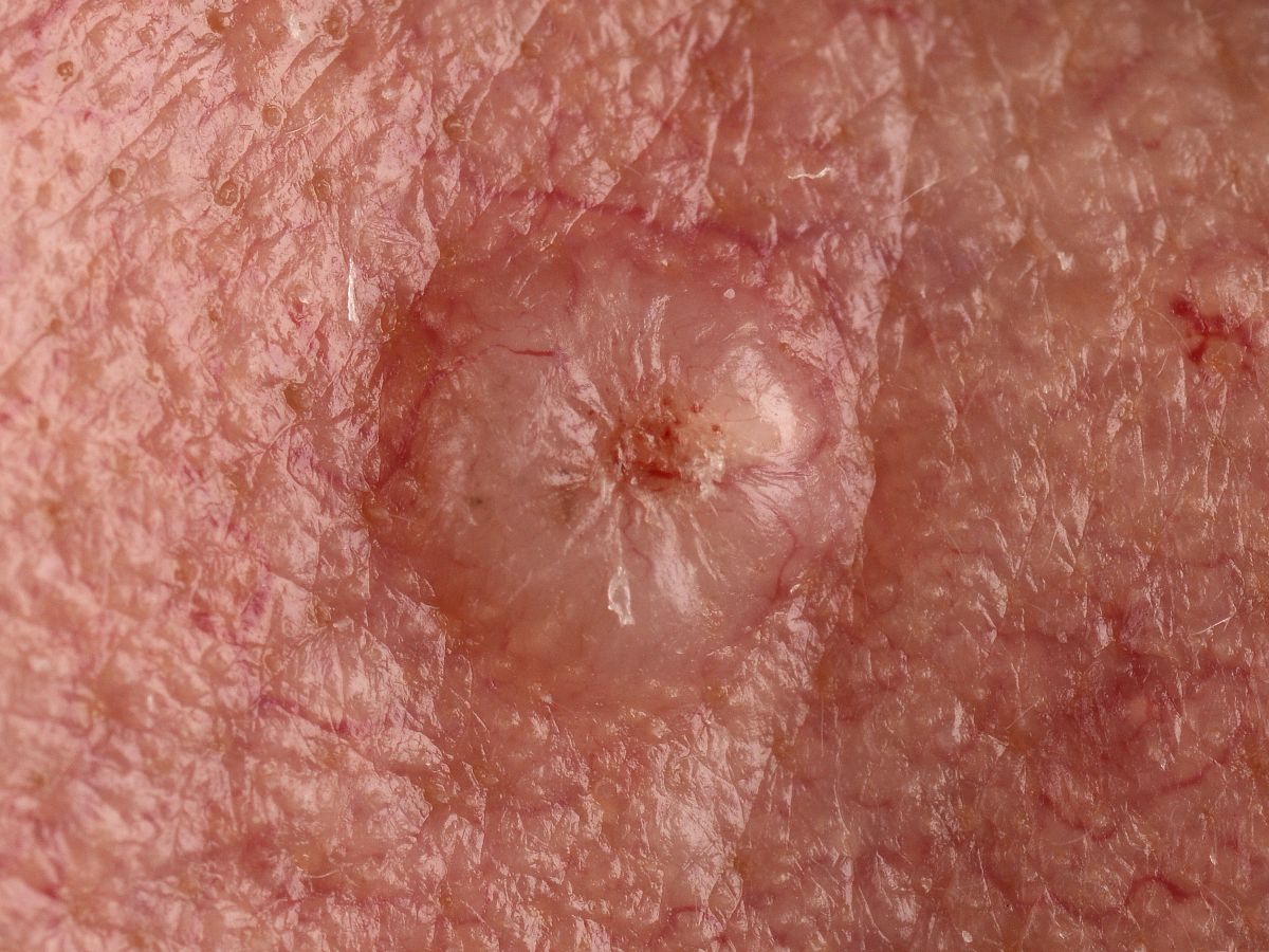 een huidkleurig of licht roze tumortje (nodulair BCC), met een glanzend-glazig