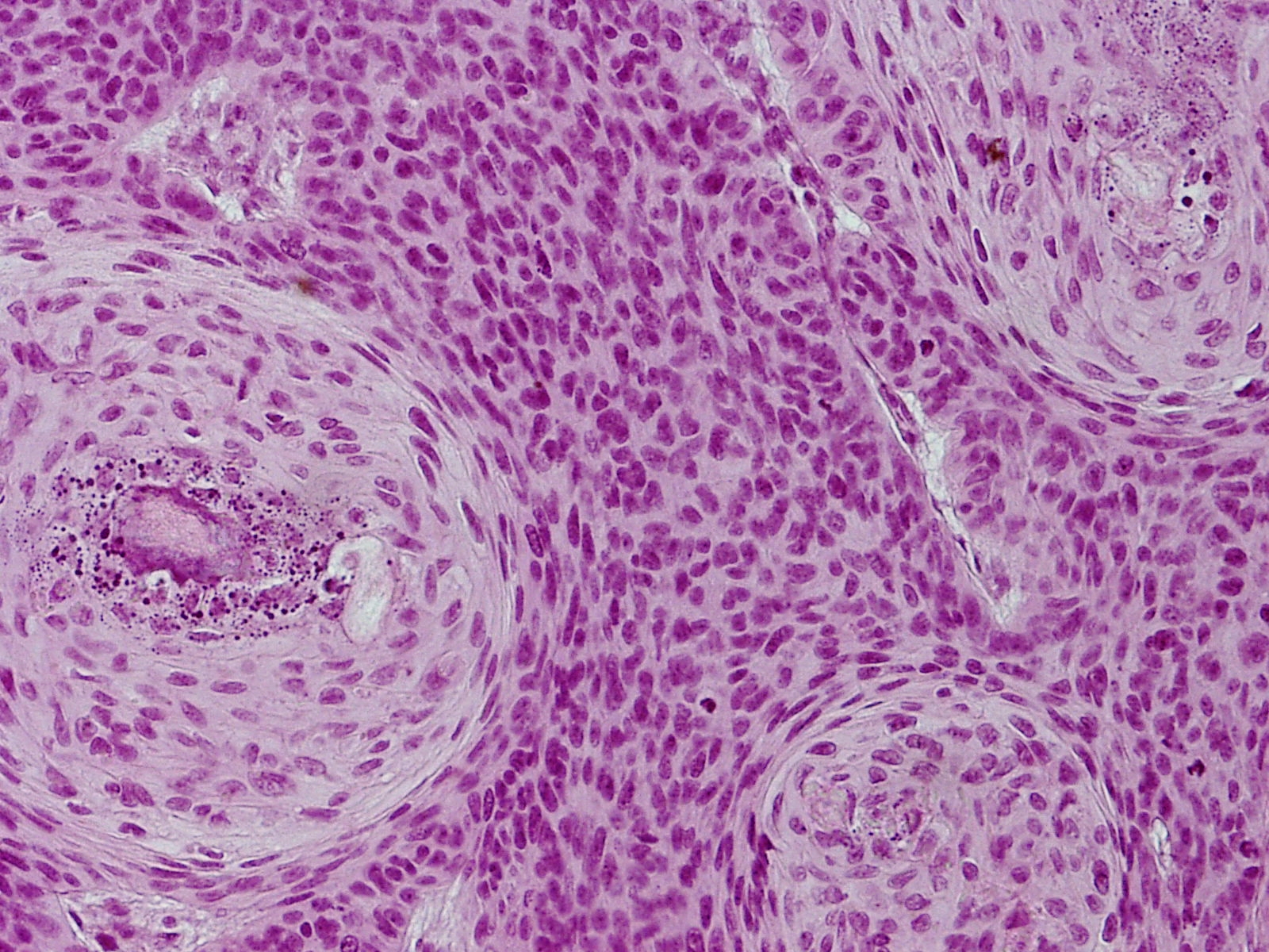 Meestal zijn er hoorncysten in het epitheel; er is een directe overgang van