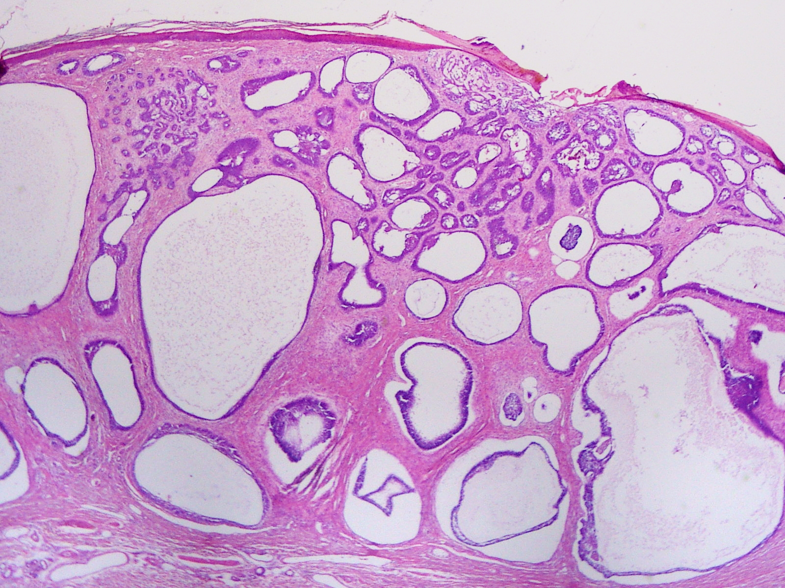 microcysteus, infundibulocysteus, pseudoglandulair (adenoïd), trichoïd, heldercellig (clear