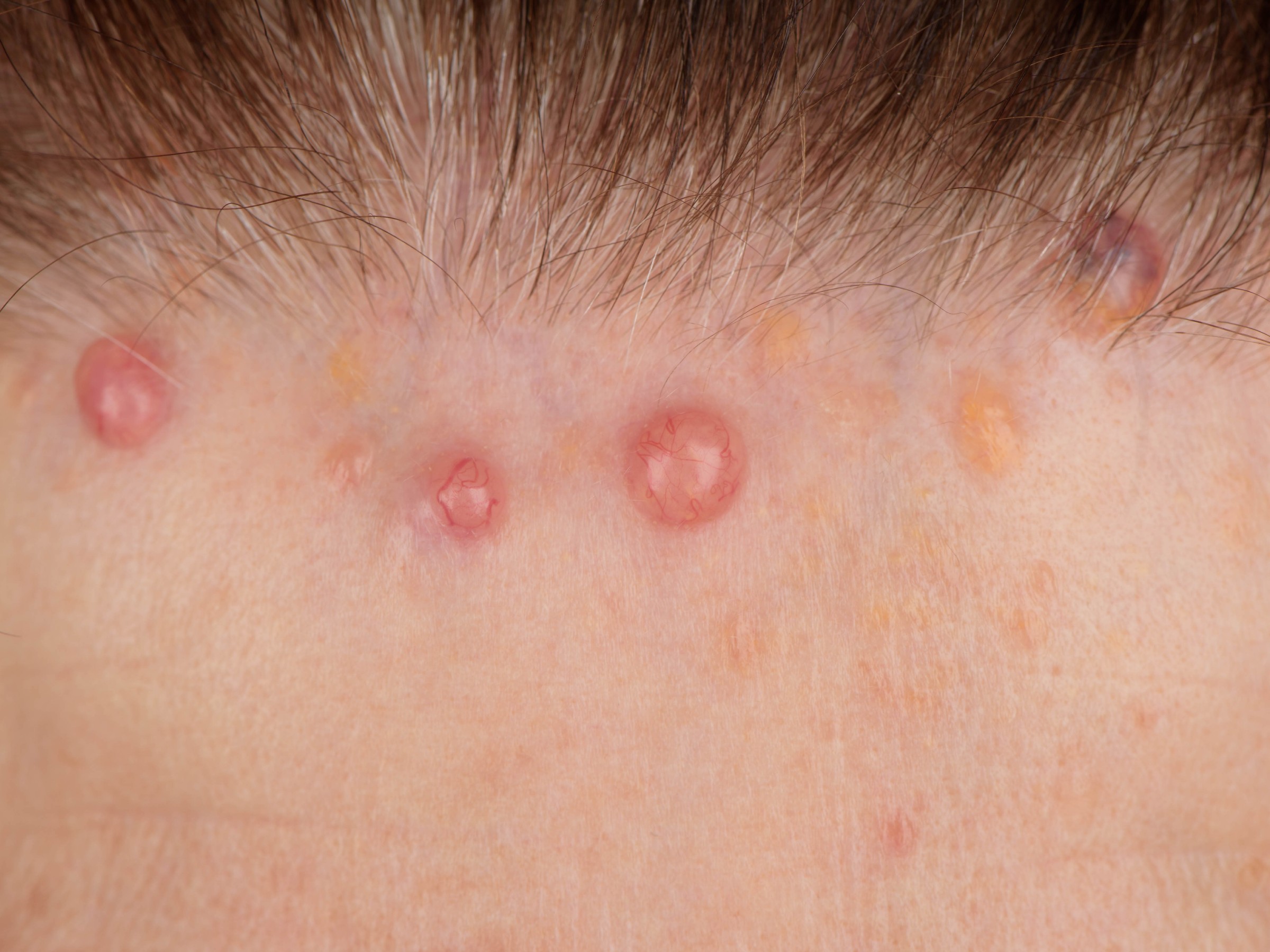 De cylindromen zitten vooral op de huid (hoofdhuid), maar kunnen ook in de borst,