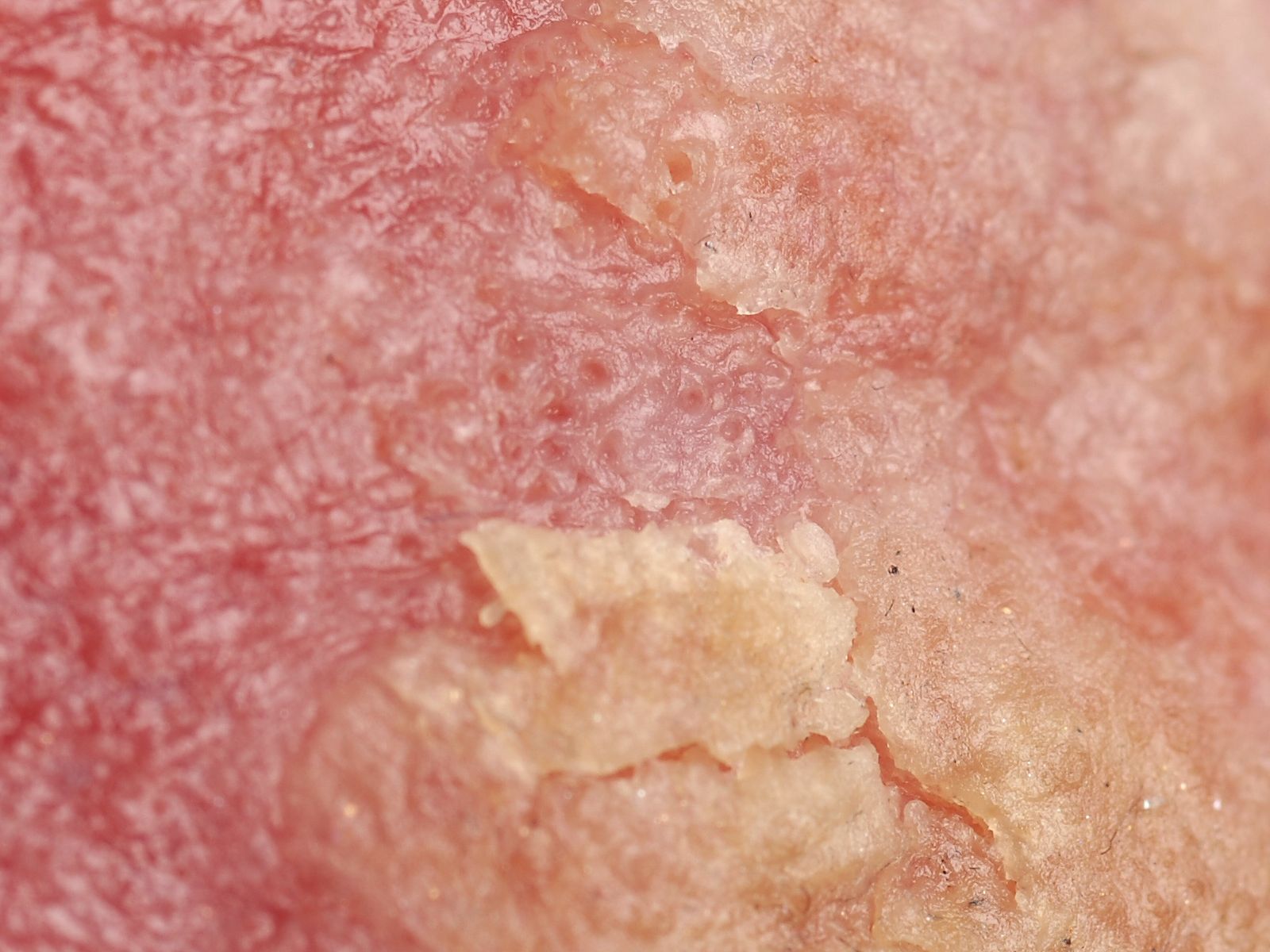 lichte schilfering. In een latere fase ontstaat een dikke en adherente
