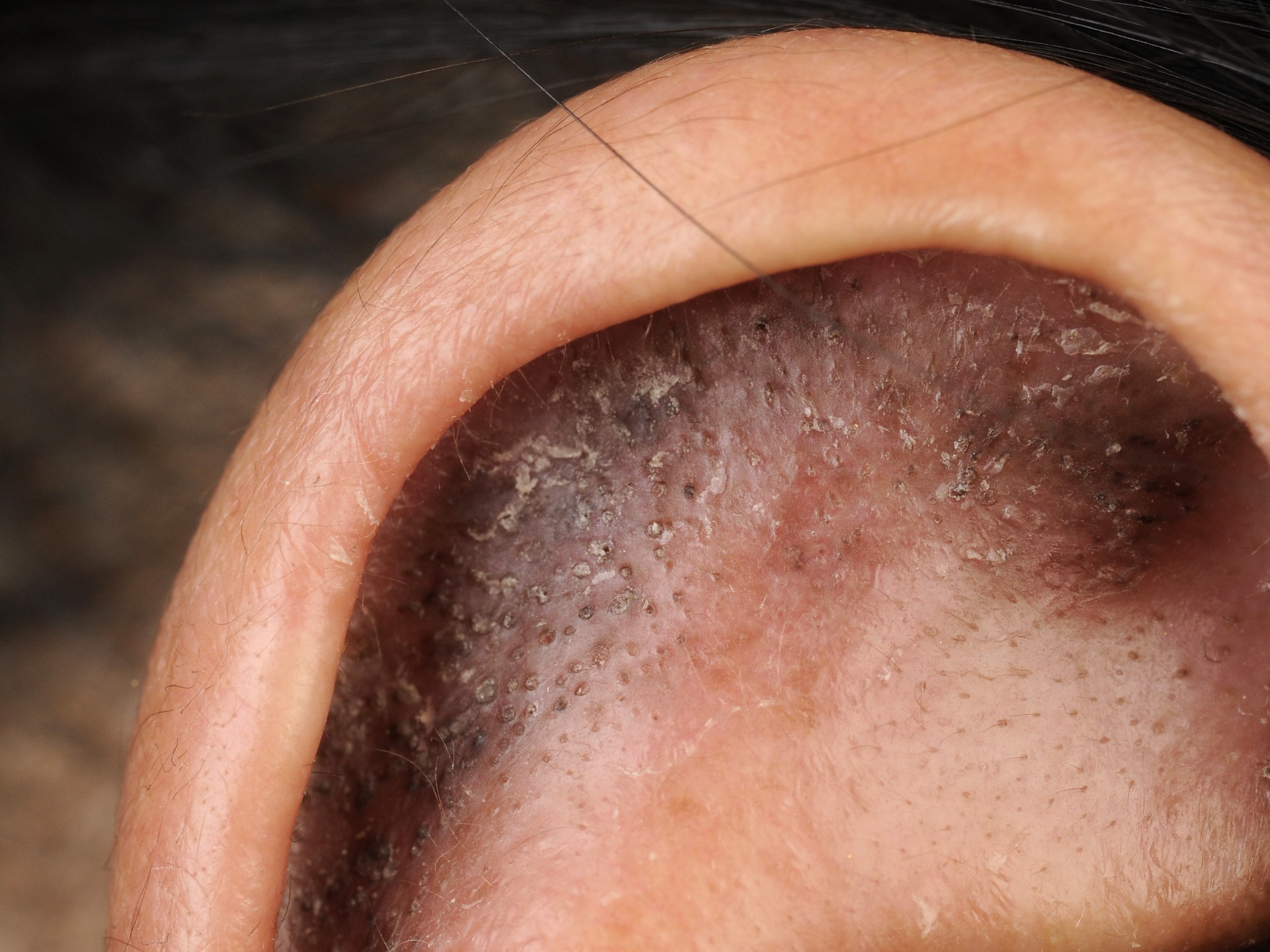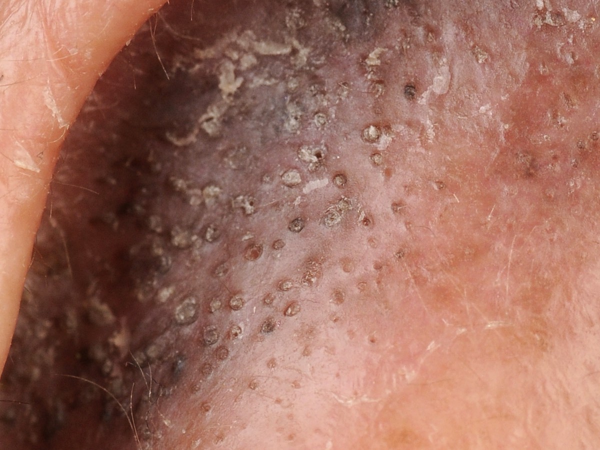 follikelopeningen zijn gedilateerd en bevatten keratotische pluggen. Een