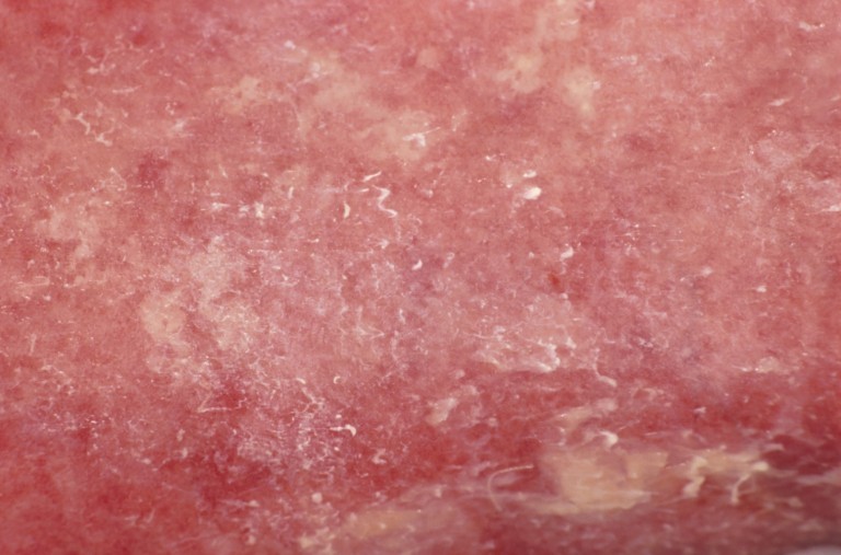ontstaat vaak uitgebreide erosies en ulceraties op plaatsen blootgesteld aan