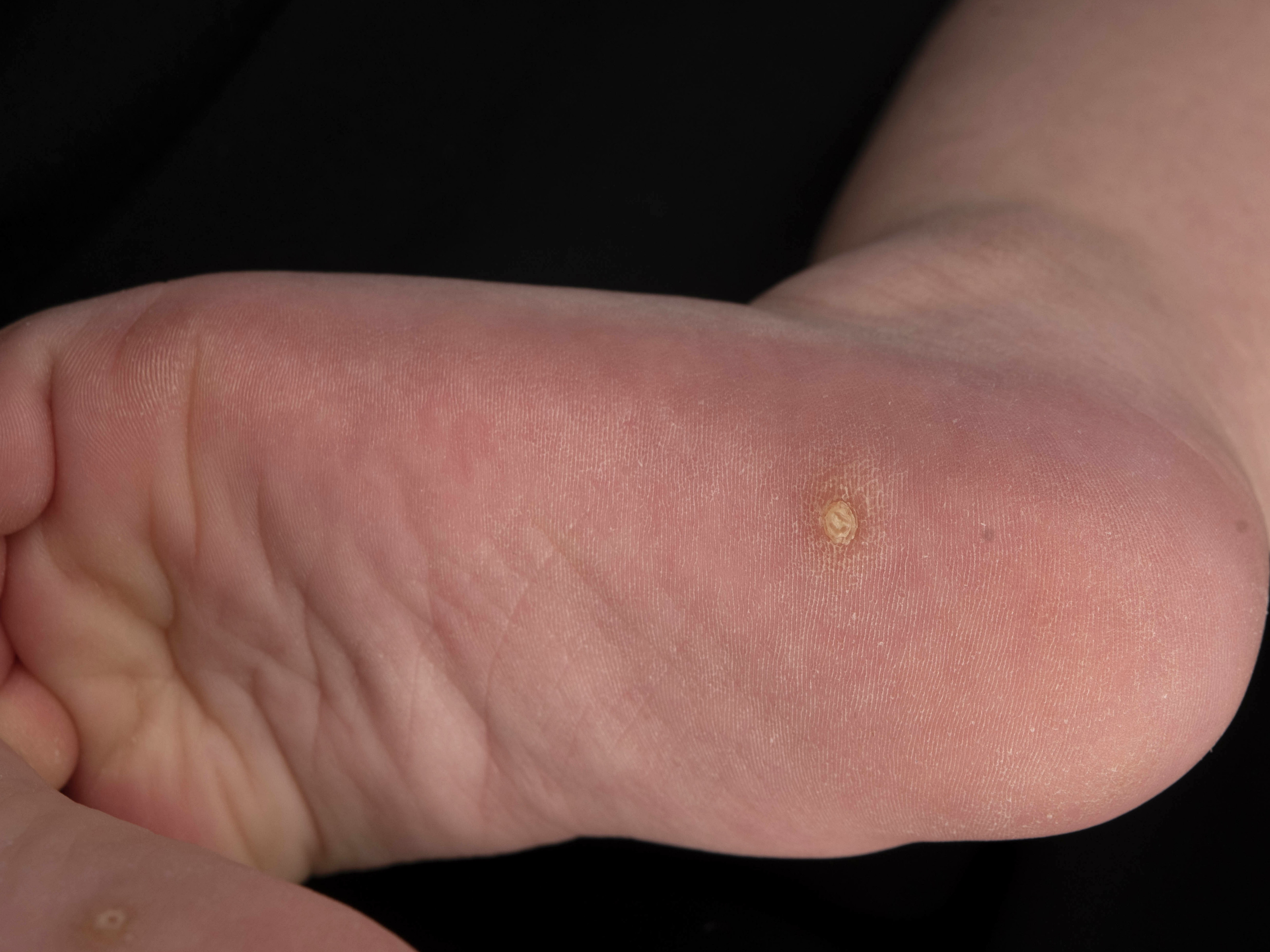 op de voetzool, soms omgeven door een collerette, op een plek waar de hielprik