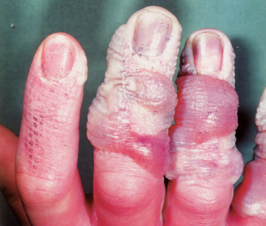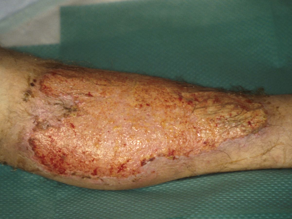 vaste stof). De huid kan afsterven, zwart of grijs verkleuren, roodheid of