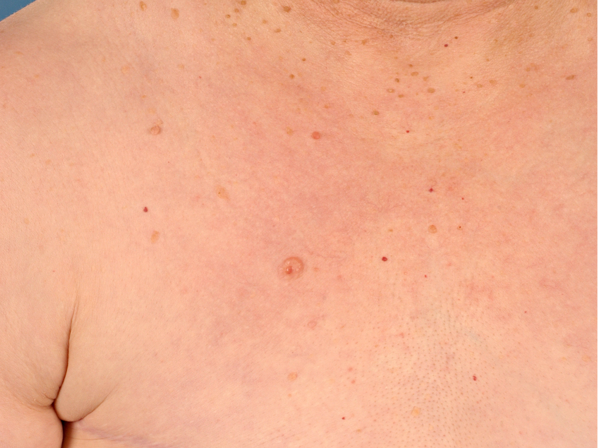 plaques of ulcererende laesies, 0.7-30 cm groot. Soms huidkleurig. Meestal solitair,