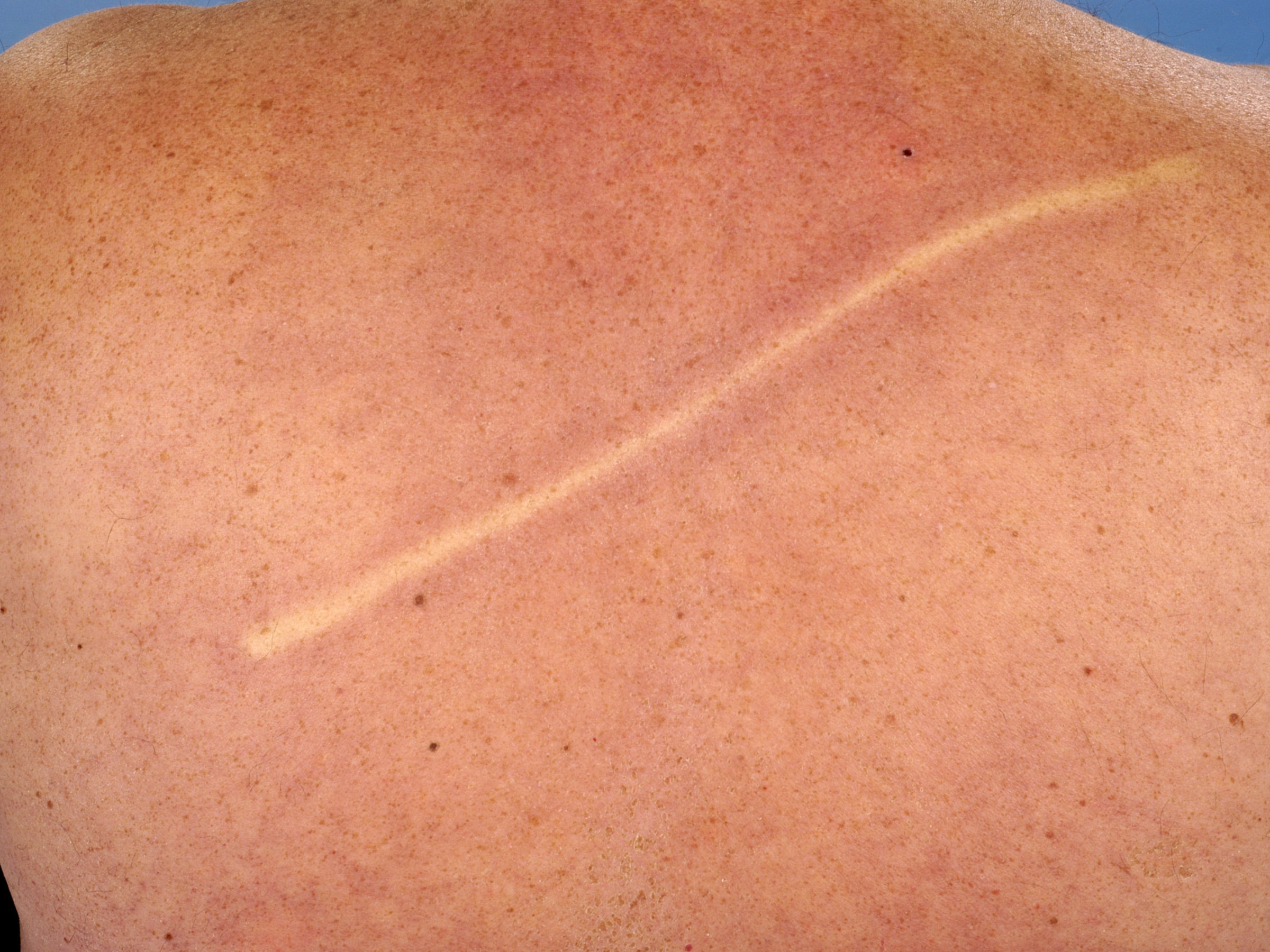 verschijnt een streepvormige kwaddel, meestal binnen 5 min, omgeven door erytheem.