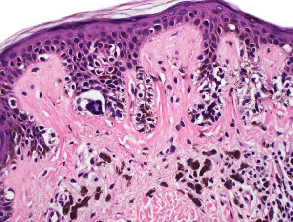 in epidermis. Melanocyten soms spoelvormig, groot, pleomorf, en met fijnstoffig