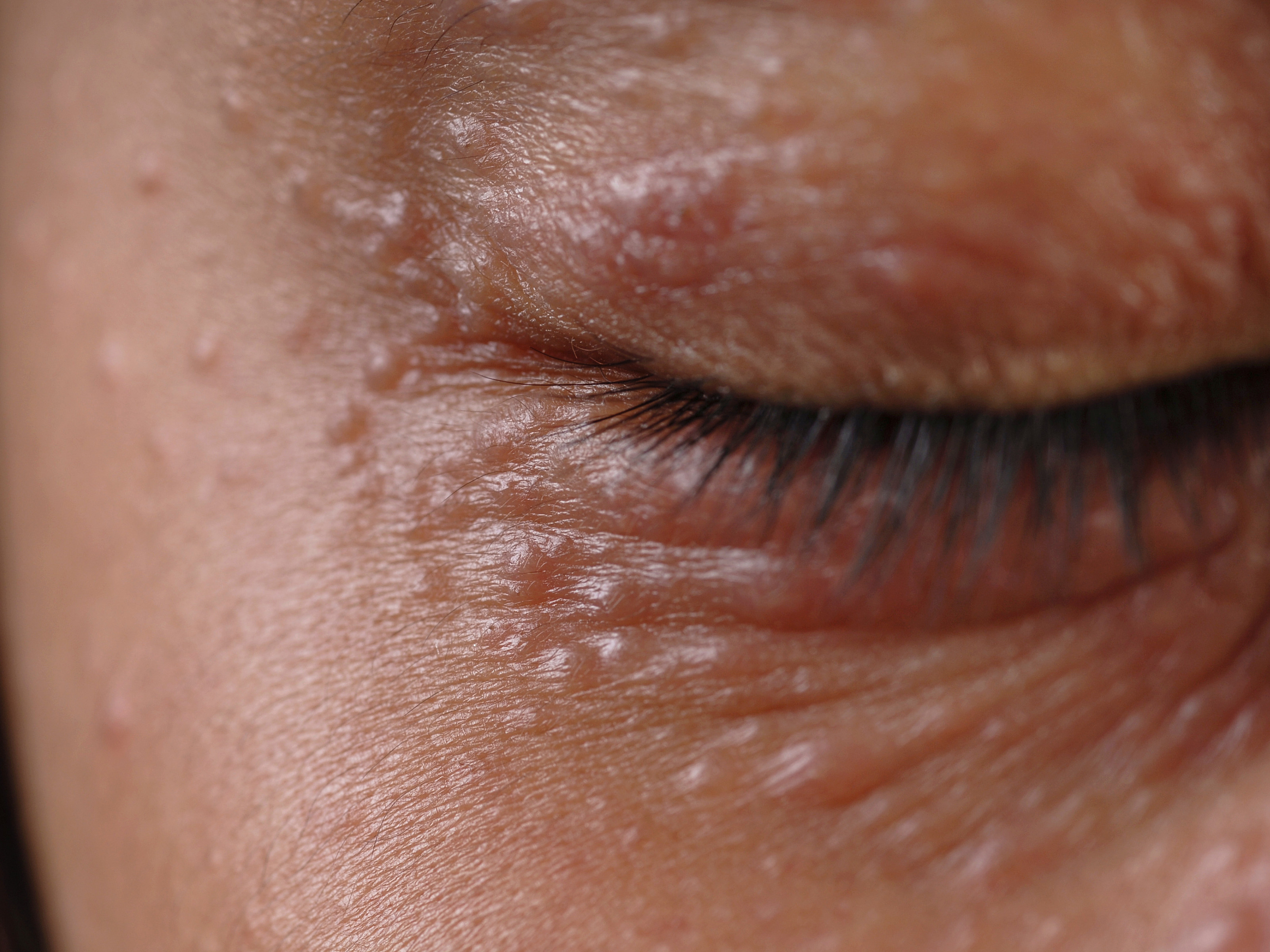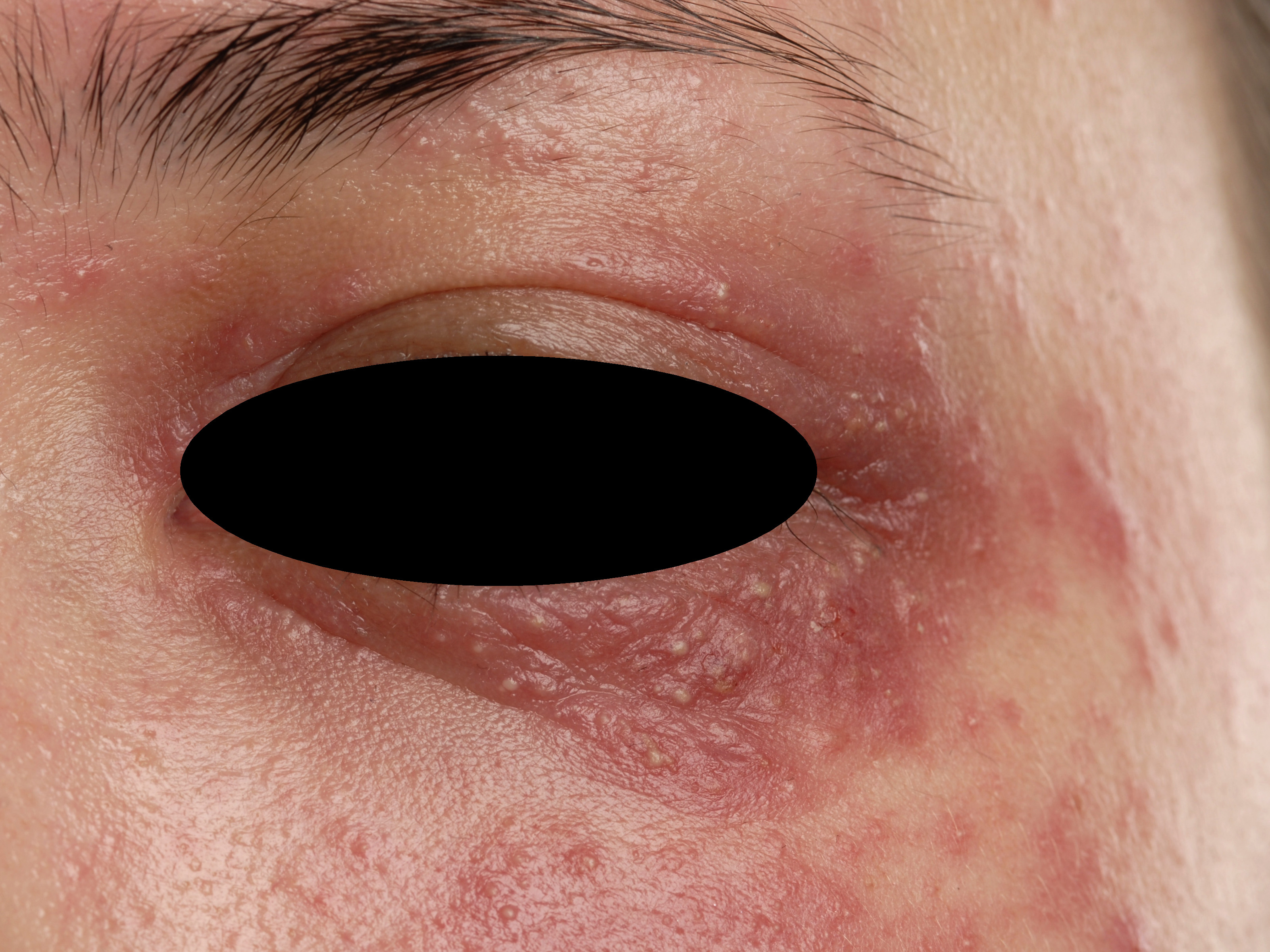 vooral gelokaliseerd rond de mond (perioraal). Als ook het gebied rond de oogleden