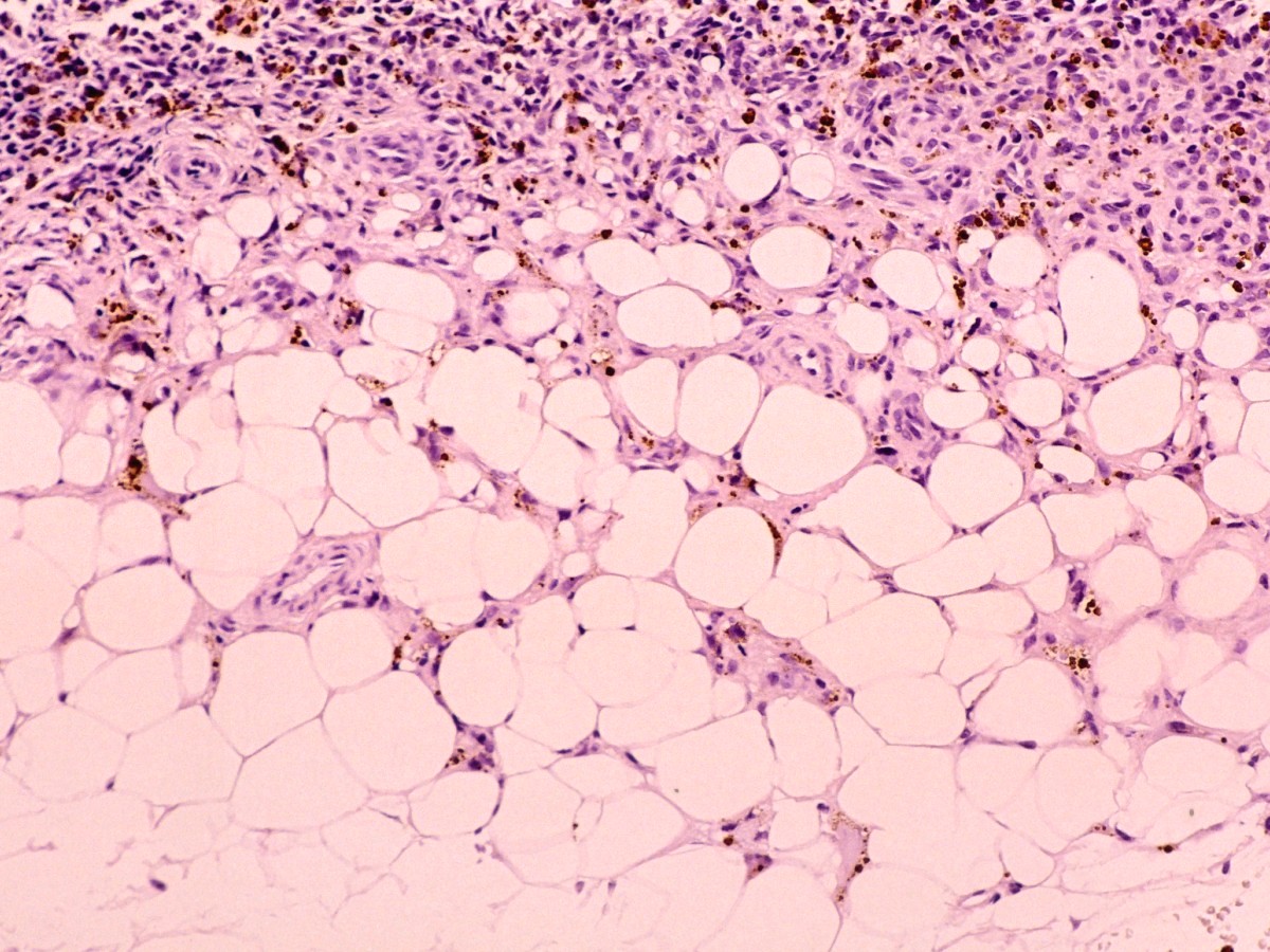 Naar de diepte is er uitbreiding in het vetweefsel. Zie ook de