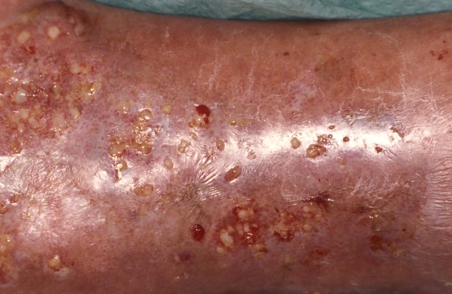 op diverse plaatsen perforeert. Vaak met lymfklierzwelling. Het spectrum van