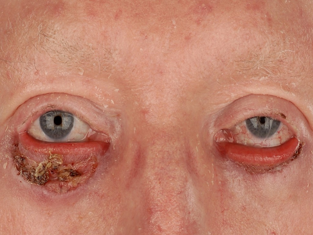 ooglid, meestal het onderste ooglid. Het komt het meest voor als