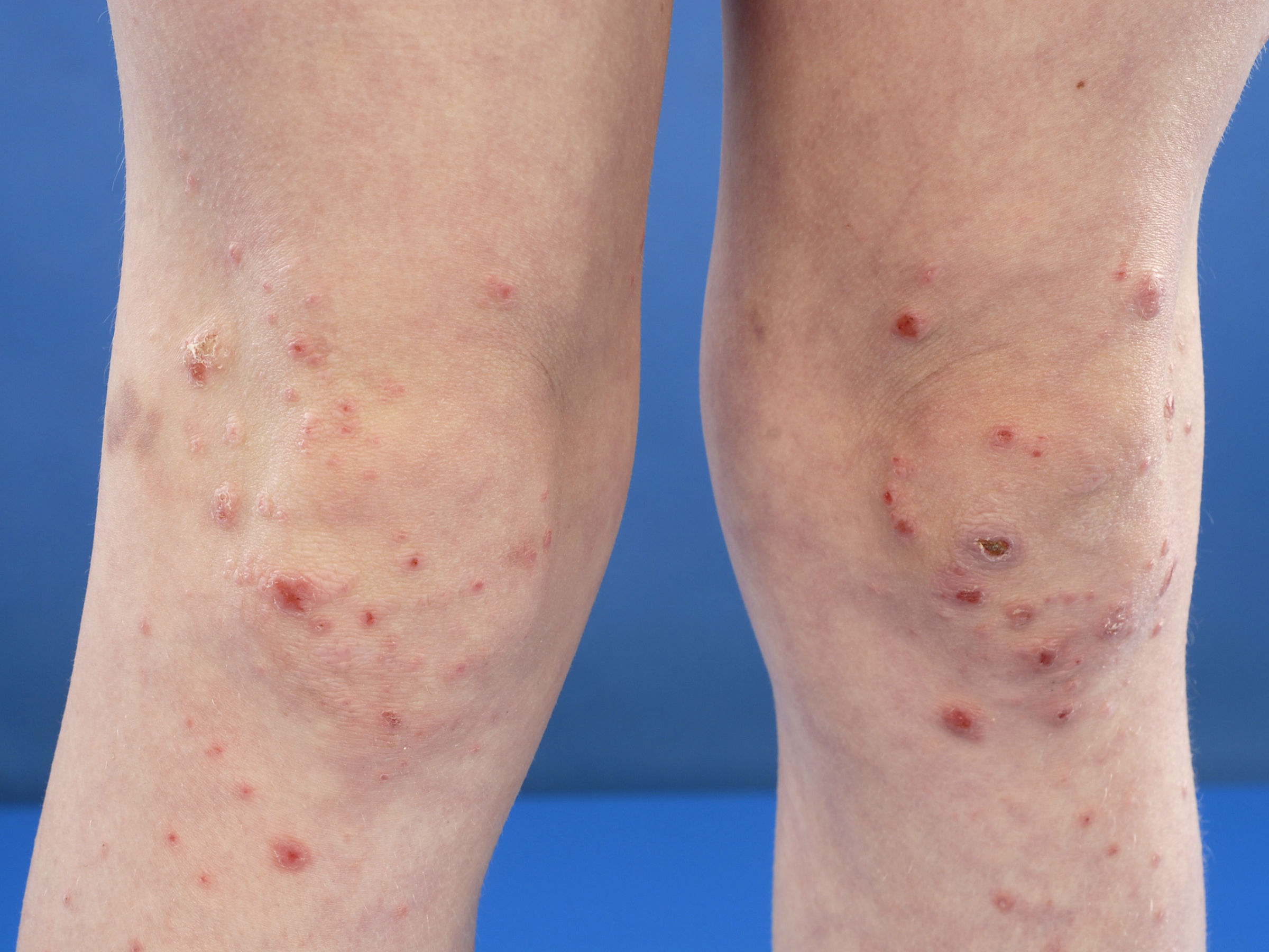 knieholten, polsen, enkels; erytheem, papels, vesikels, ook droog/rhagaden/lichenificatie.