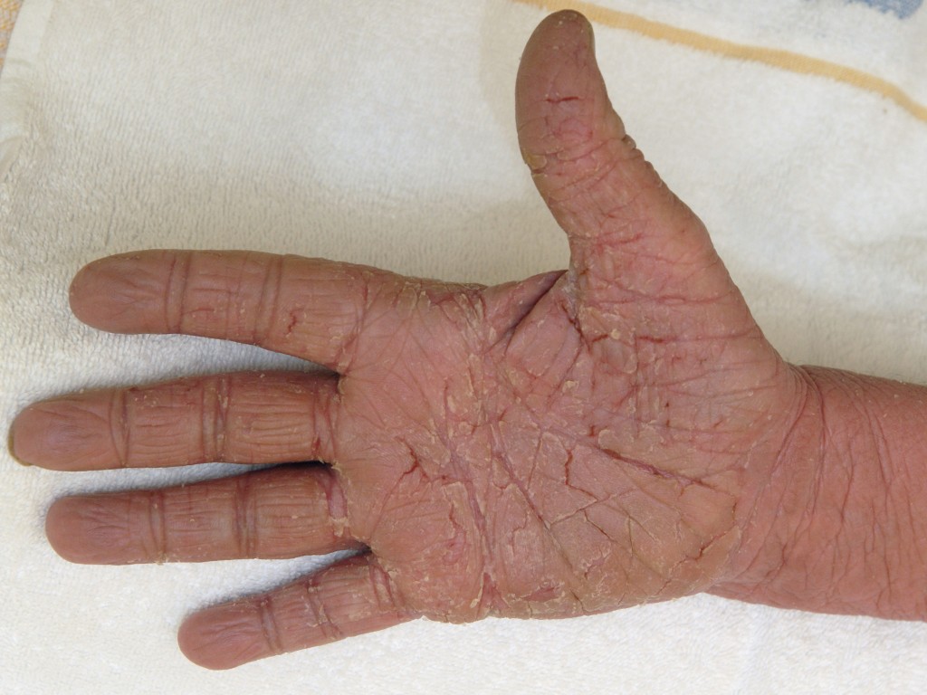 schilfering, hyperkeratosen en rhagaden, droge huid, dunne vingertoppen met