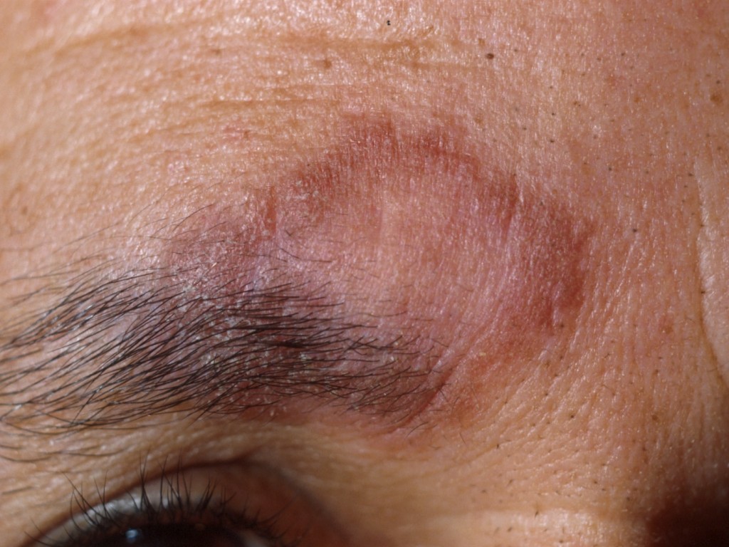 huidkleurige, erythemateuze of rood-bruine annulaire plaques met een verheven