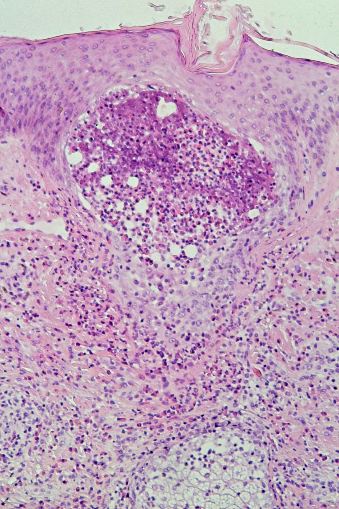 gevuld met een grote hoeveelheid eosinofiele granulocyten. De pustels zijn meestal
