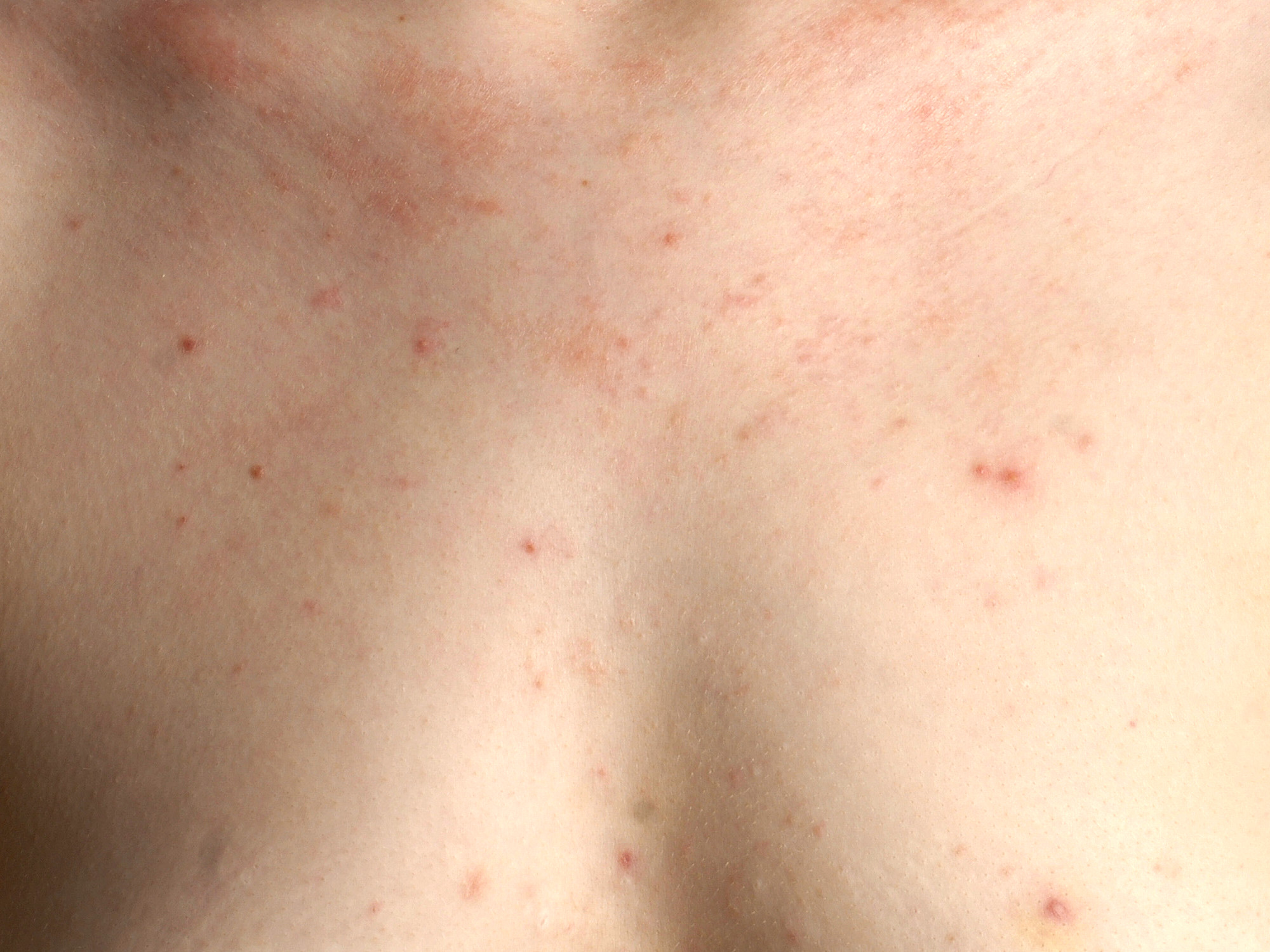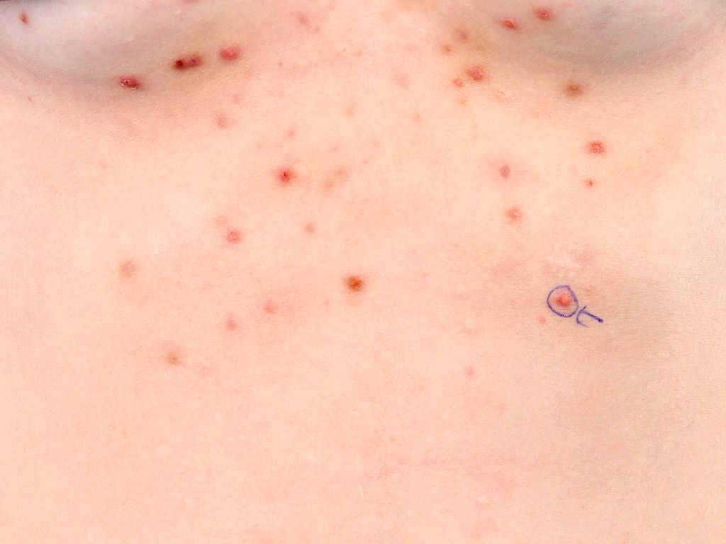 Begint al op kinderleeftijd. Vooral op de romp (borst en buik), maar kan ook