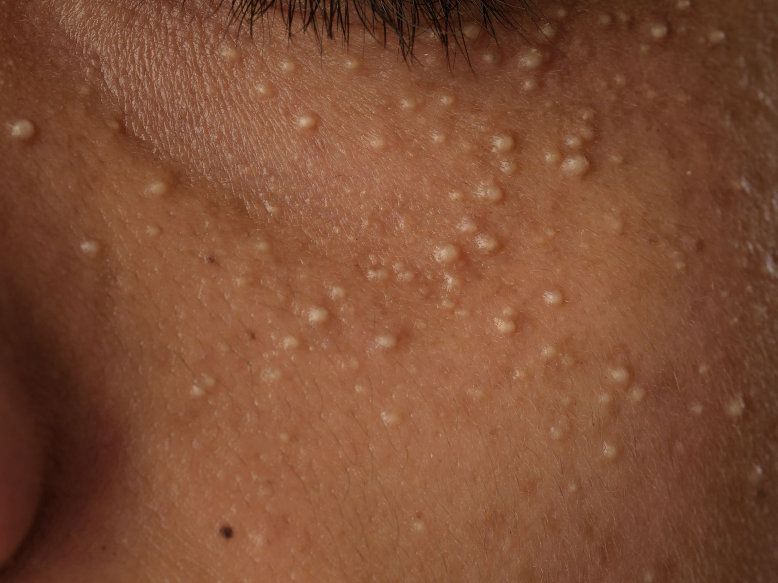 grote huidkleurige papels, bestaande uit cysten uitgaande van de haarfollikel.