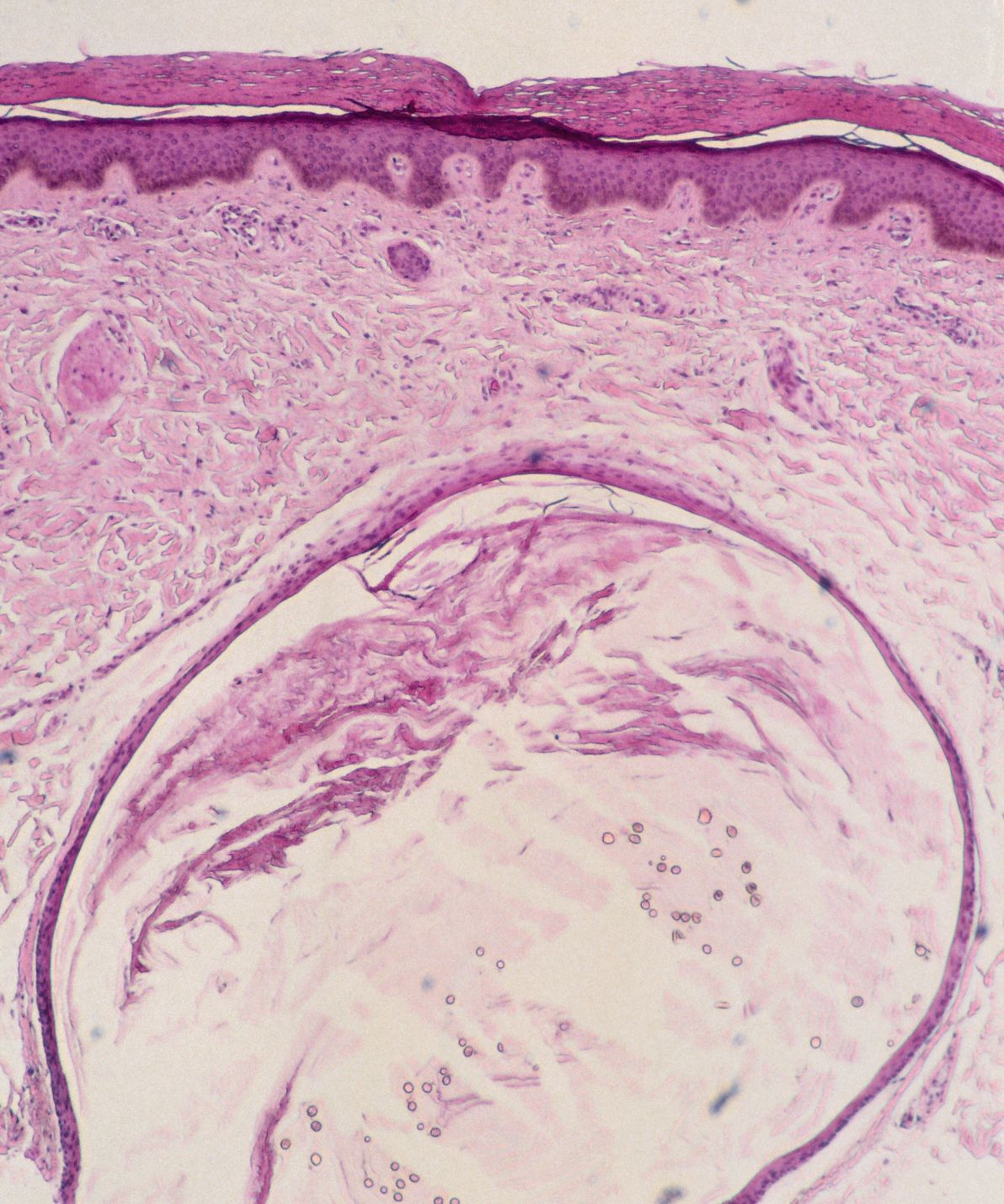 van een haarfollikel, gevuld met hoorn en talrijke kleine vellusharen.