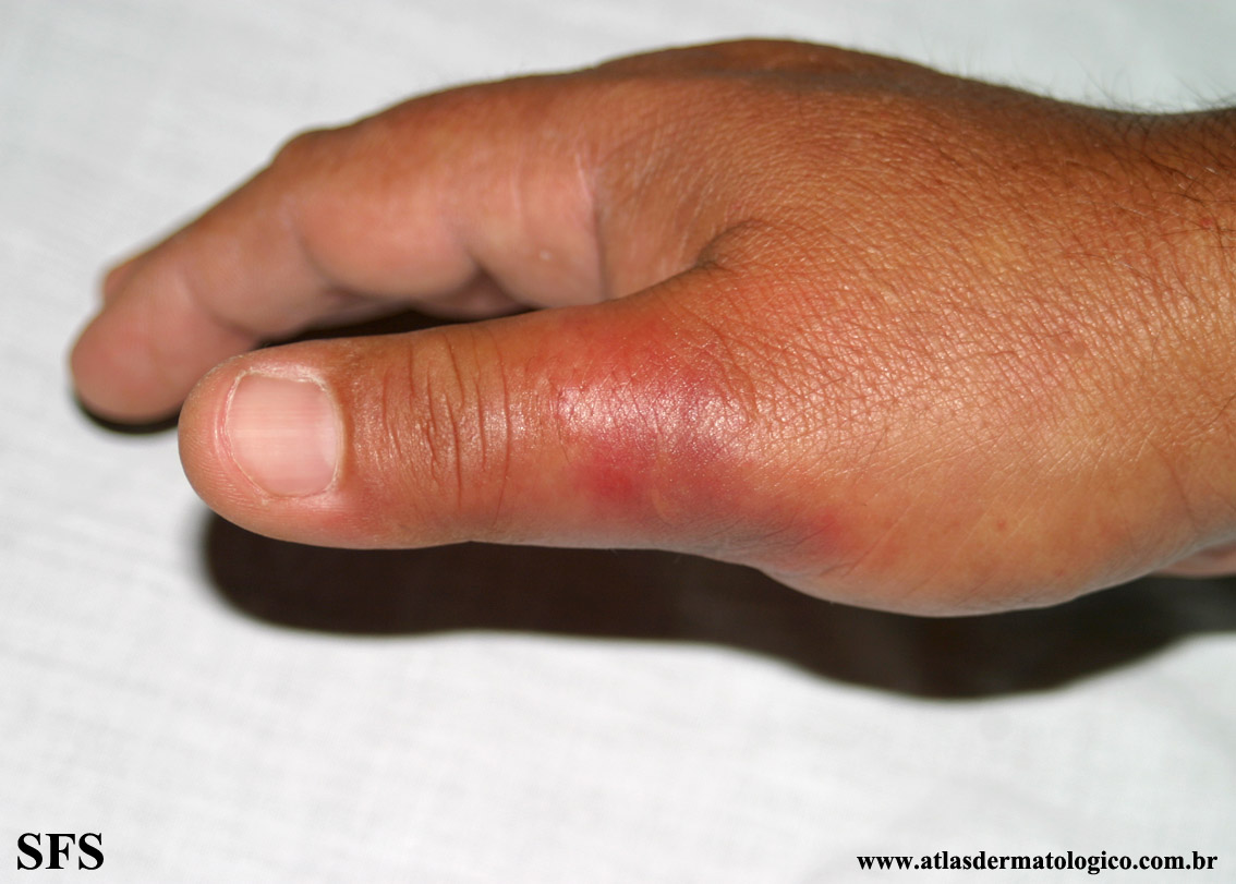 ![Erysipeloid (click on photo to enlarge) [source: Samuel Freire da Silva - Dermatology Atlas - Wikidocs - Creative Commons License 3.0] Erysipeloid](../../../images/erysipeloid-1z.jpg) |