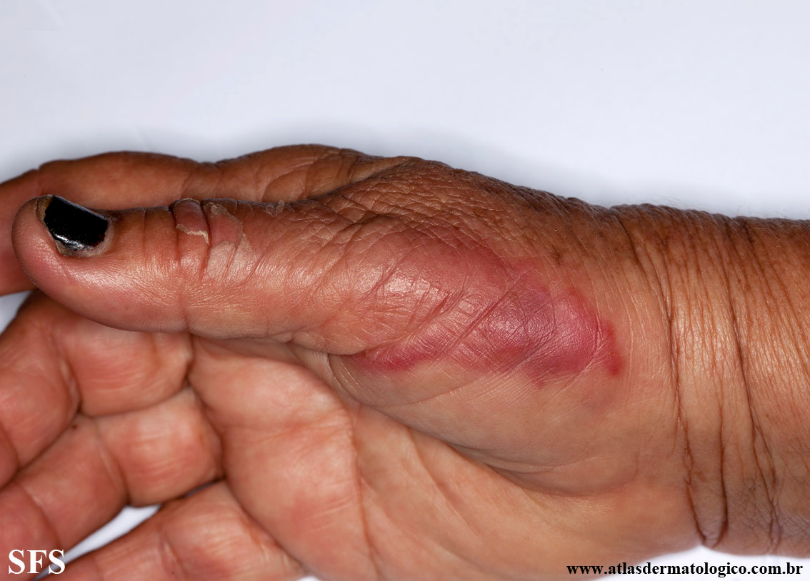 ![Erysipeloid (click on photo to enlarge) [source: Samuel Freire da Silva - Dermatology Atlas - Wikidocs - Creative Commons License 3.0] Erysipeloid](../../../images/erysipeloid-2z.jpg) |