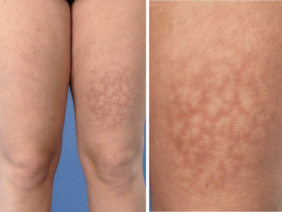 waarbij een rode of paars-blauwe verkleuring in een reticulair patroon ontstaat,