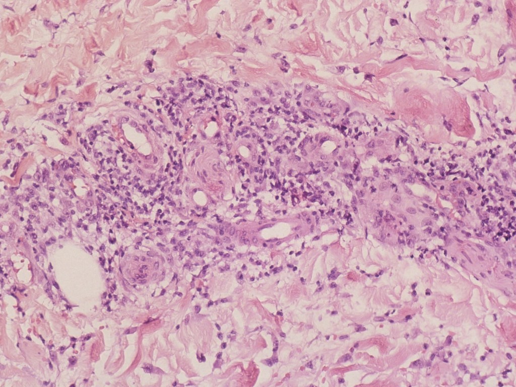 lymfocytair infiltraat aanwezig. Typisch in vroege laesies is een ontsteking in