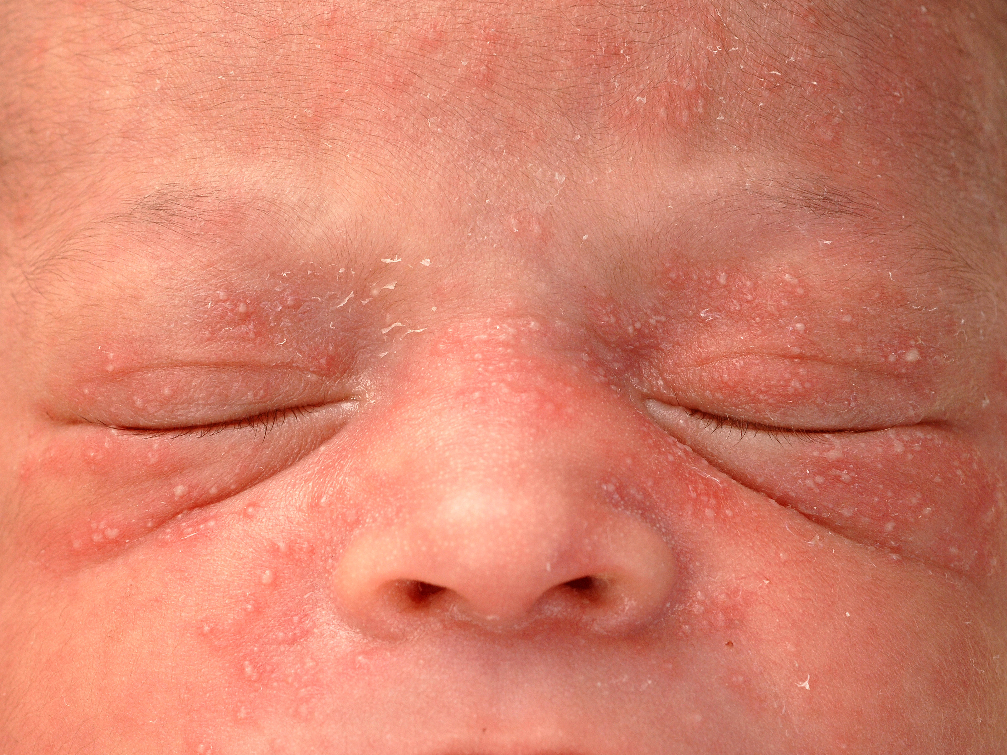 de geboorte. Klinisch zijn er 1-2 mm grote pusteltjes, papeltjes en kleine erythemateuze