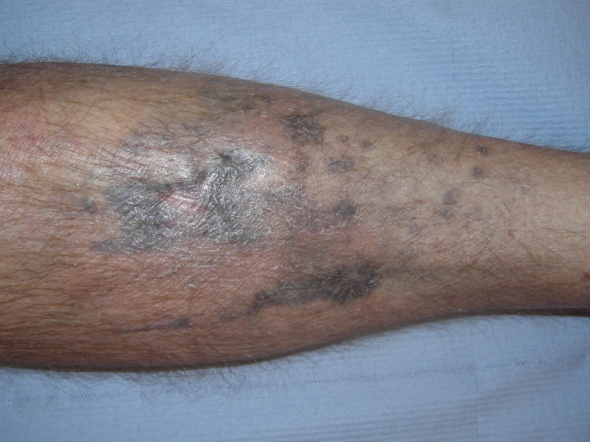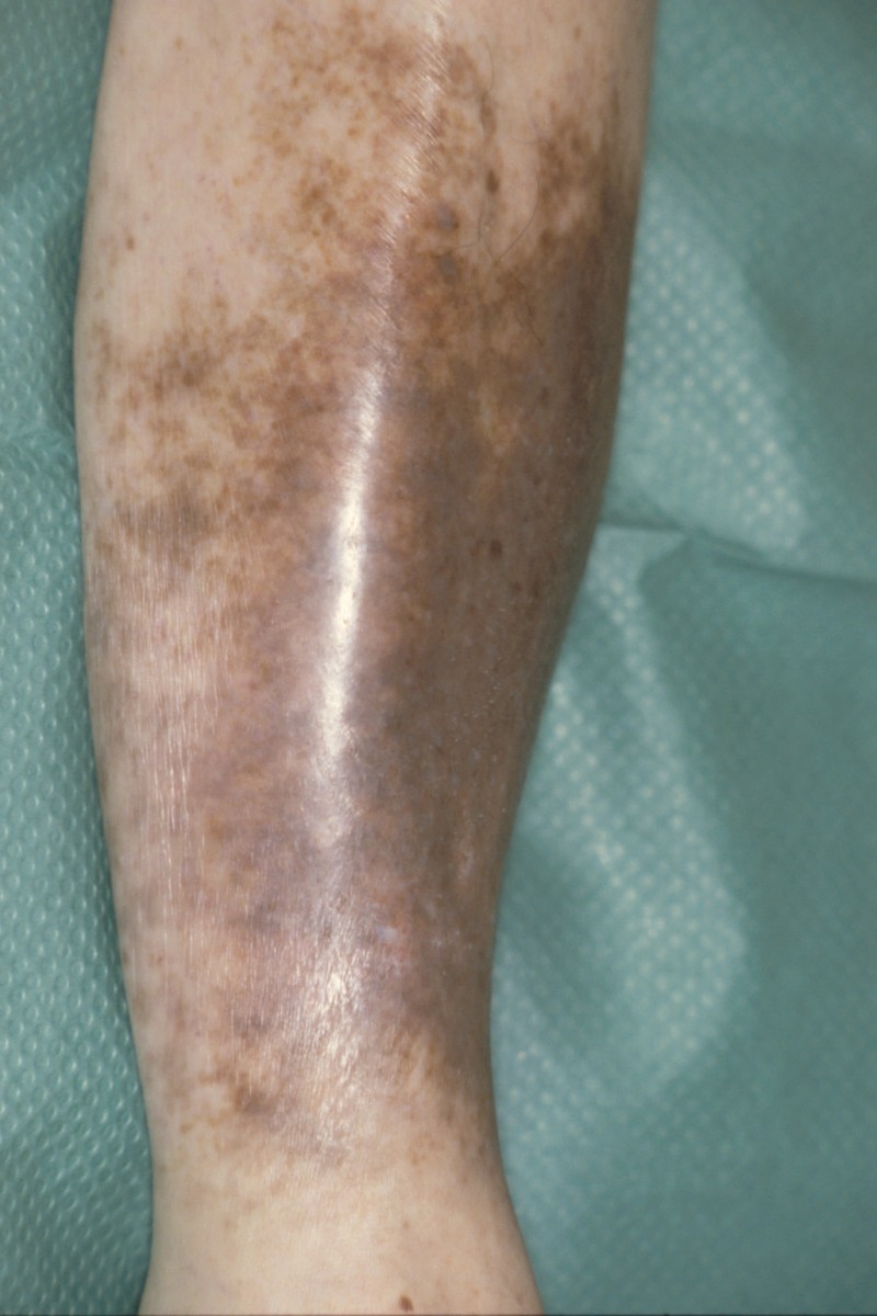 hyperpigmentatie - morbus Addison - zonverbranding - psoralenen - geneesmiddelen - hemosiderosis, het bruin ijzerhoudend pigment (hemosiderin) na erytrocyten extravasatie - purpura jaune d'ocre (okergele-lichtbruine hemosiderine hyperpigmentatie bij veneuze insufficiëntie) |