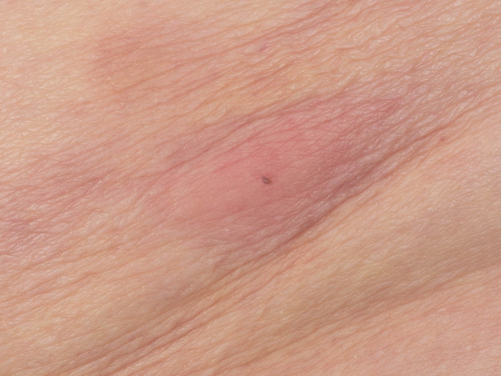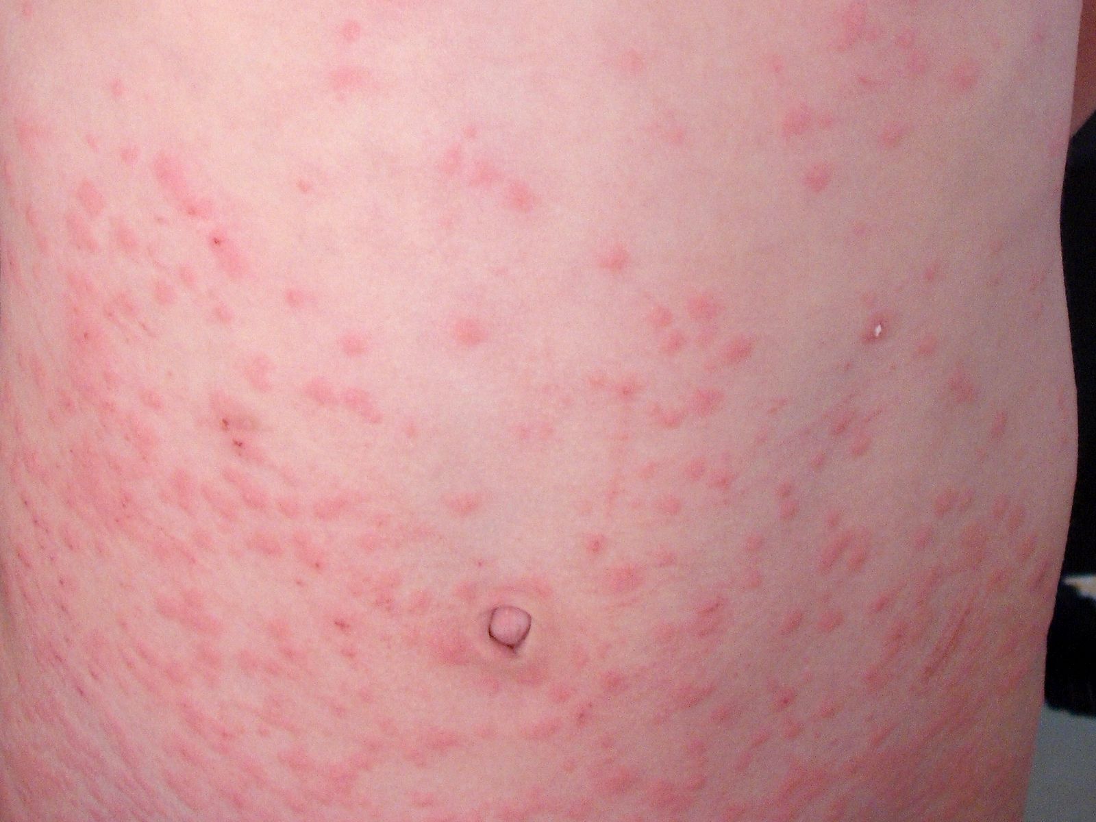 erytheem, urtica, krabeffecten, en later secundaire infectie
