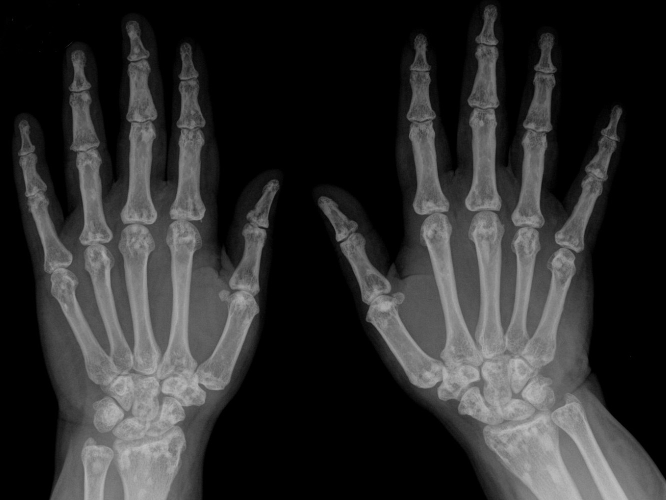 elastine vezels aan te tonen. X-handen, polsen, voeten, enkels en bekken met
