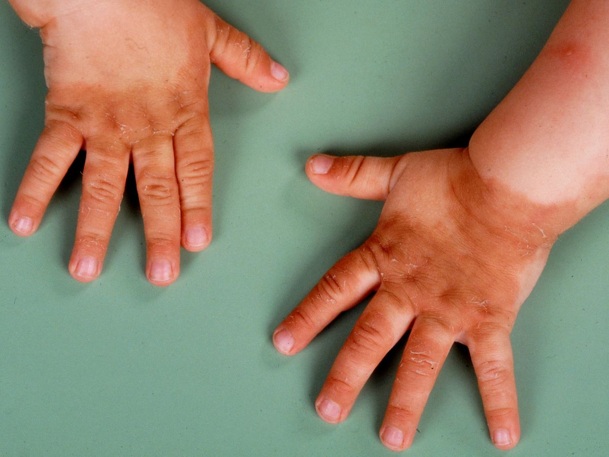 vingers en gezicht. De romp is vaak gespaard. Het ontstaat op kinderleeftijd,