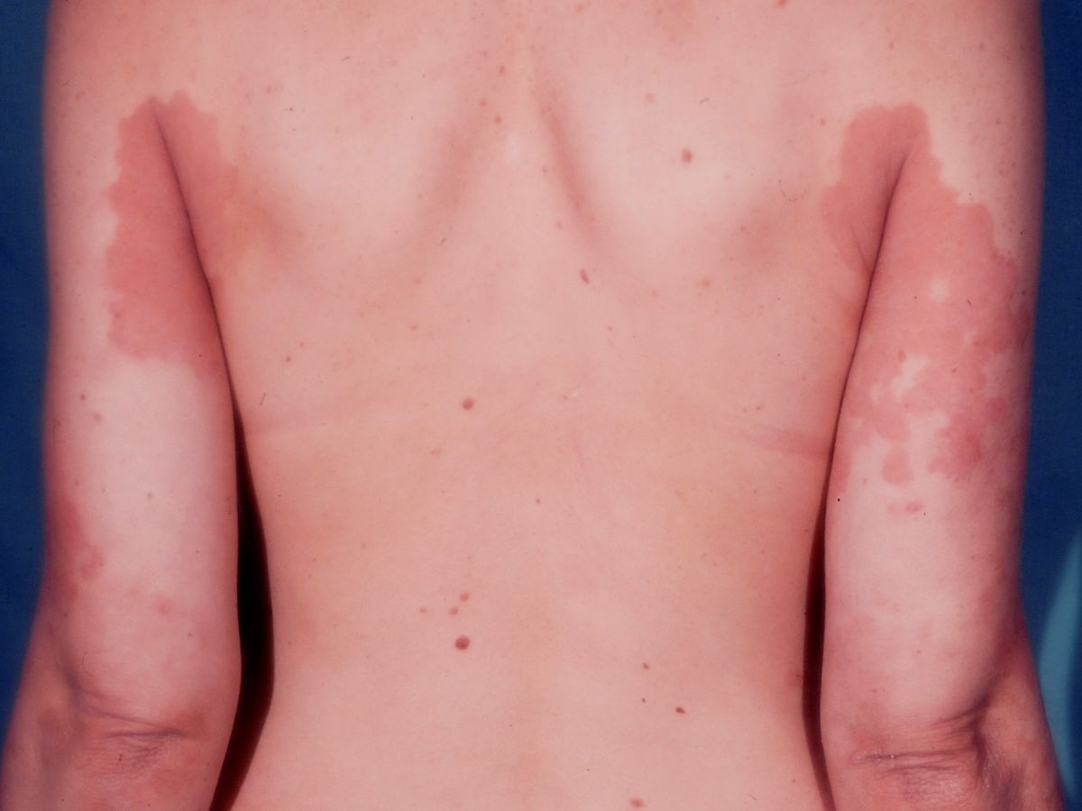 plaques met erythemateuze randen symmetrisch op extremiteiten, billen, schouders,