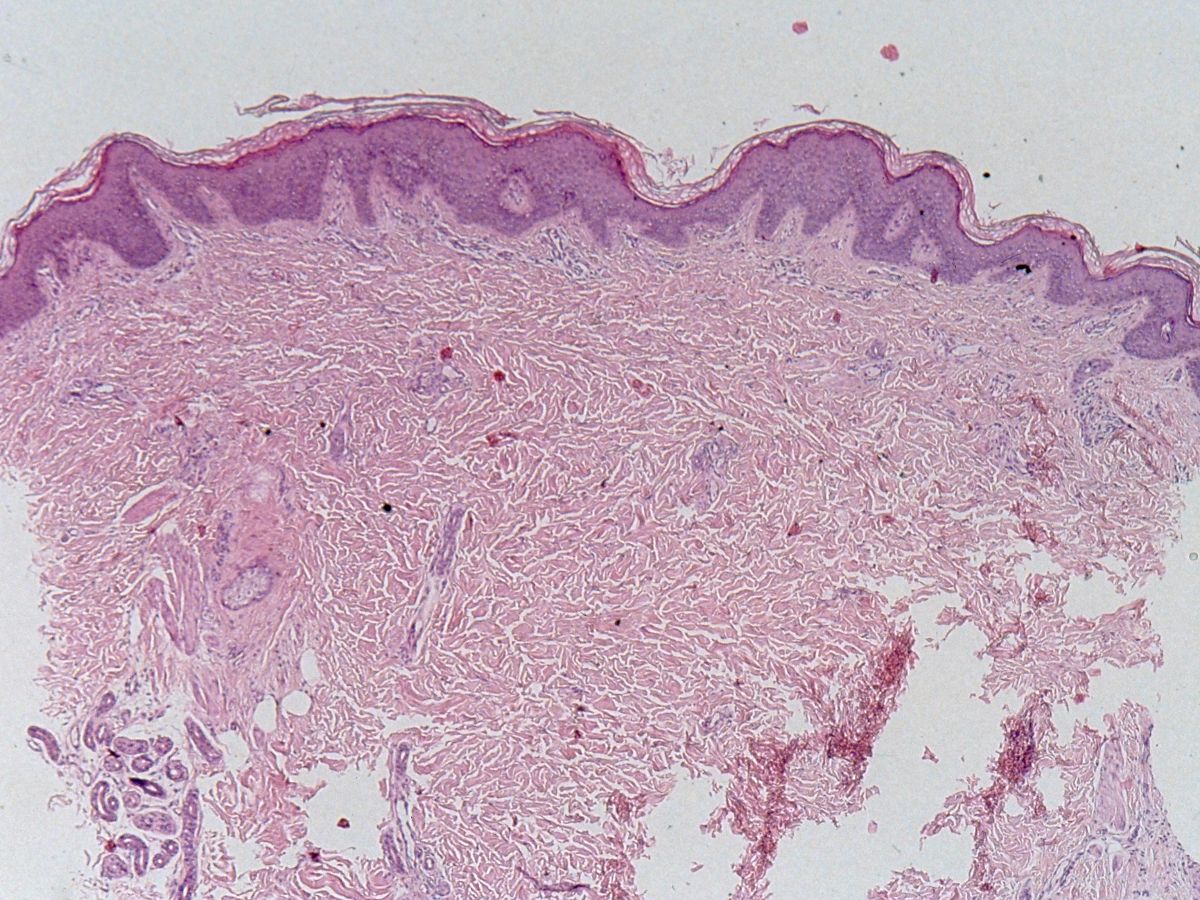 Histopathologie (aspecifiek): Basket weave hyperkeratose,