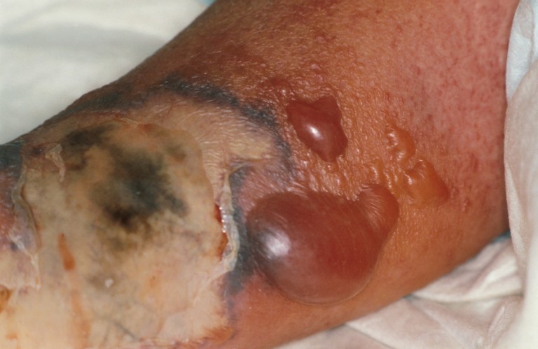verkleuring van de huid met formatie van bullae (haemorrhagisch) en zwarte necrose.