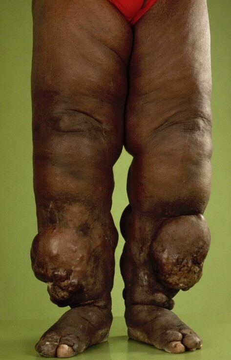 lymfoedeem, van de benen en vaak ook van de genitaliën (scrotum respectievelijk