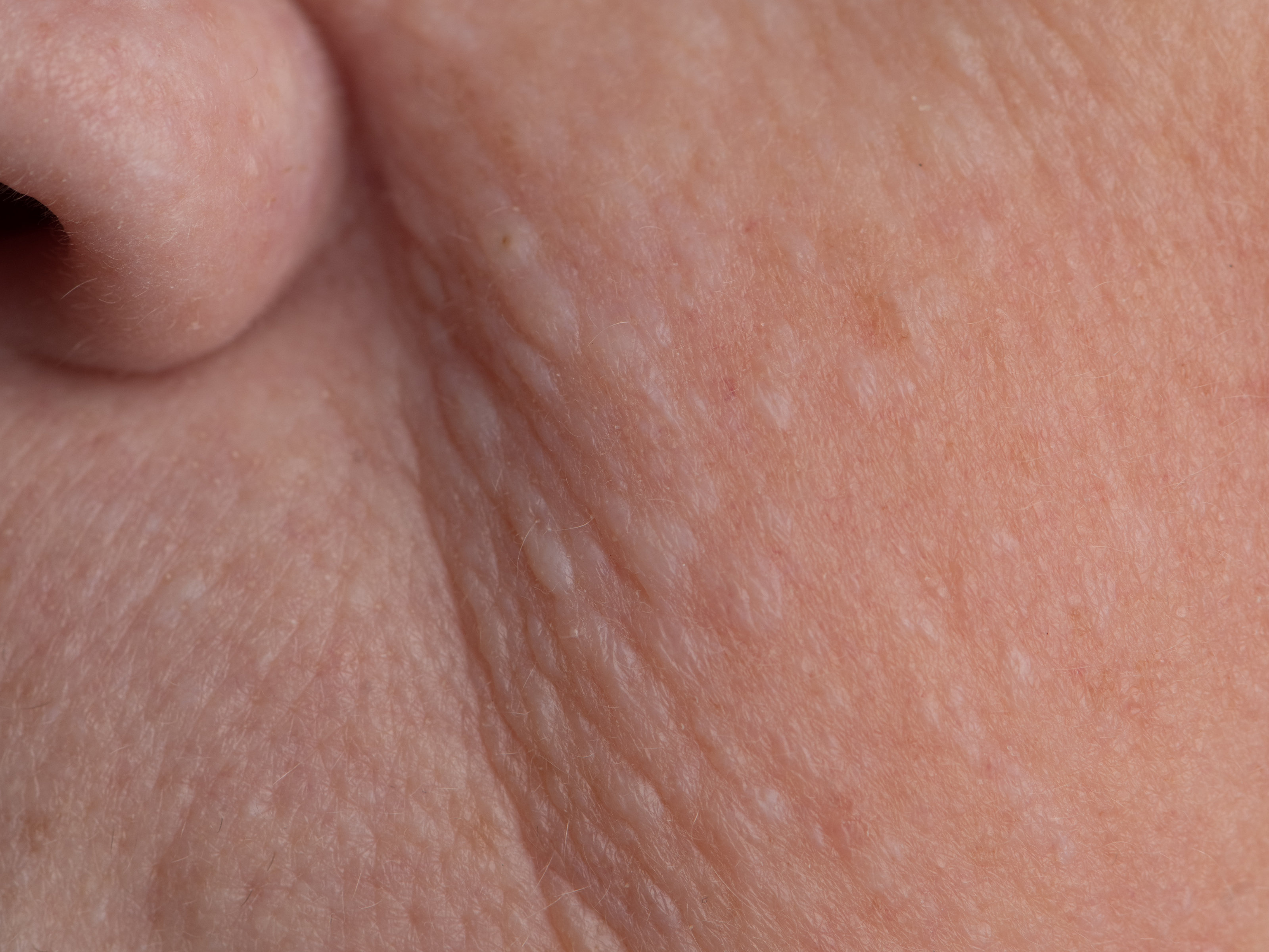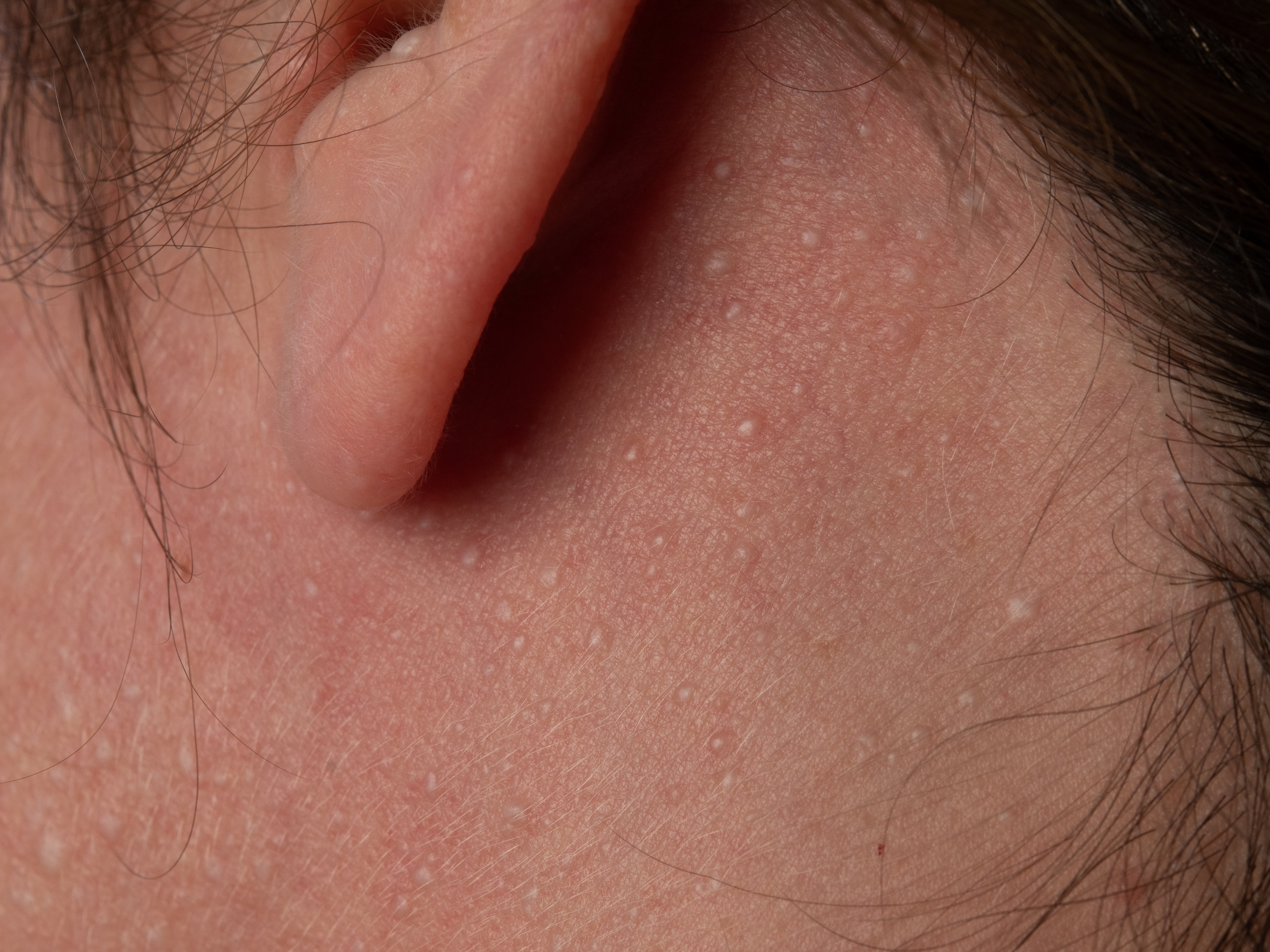 Fibrofolliculomen zijn kleine huidkleurige perifolliculaire papeltjes