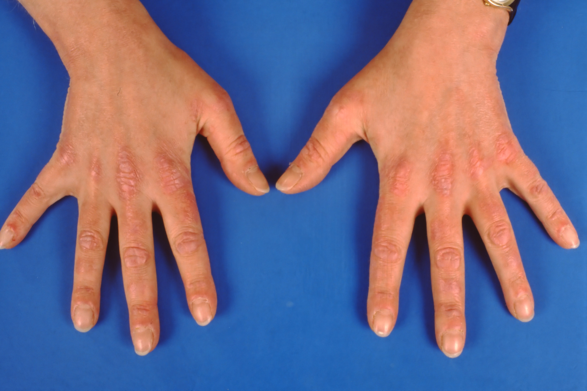 op de interfalangeale en/of metacarpofalangeale gewrichten, soms ook op de ellebogen