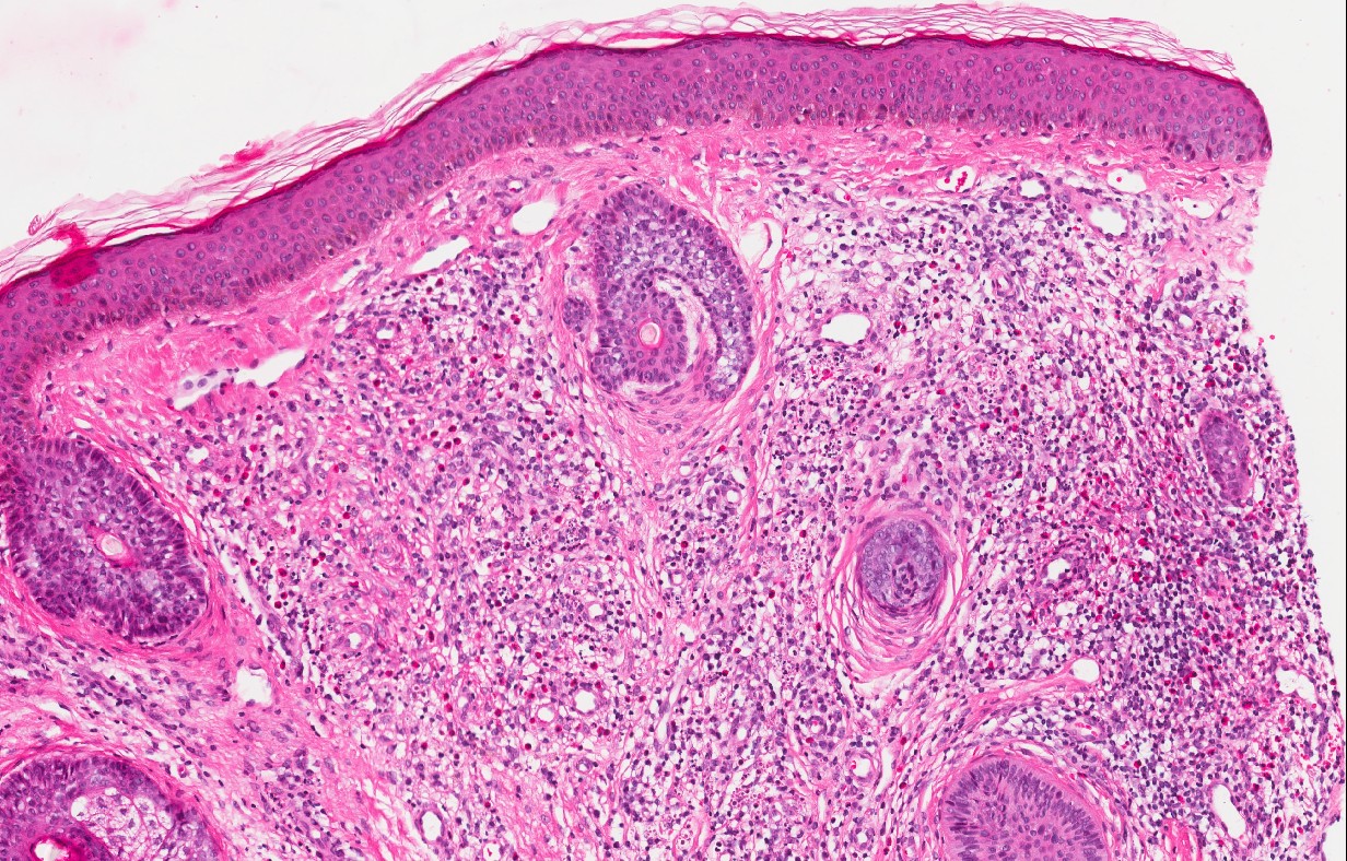 zone is tussen het infiltraat in de dermis en de epidermis en haarfollikels.