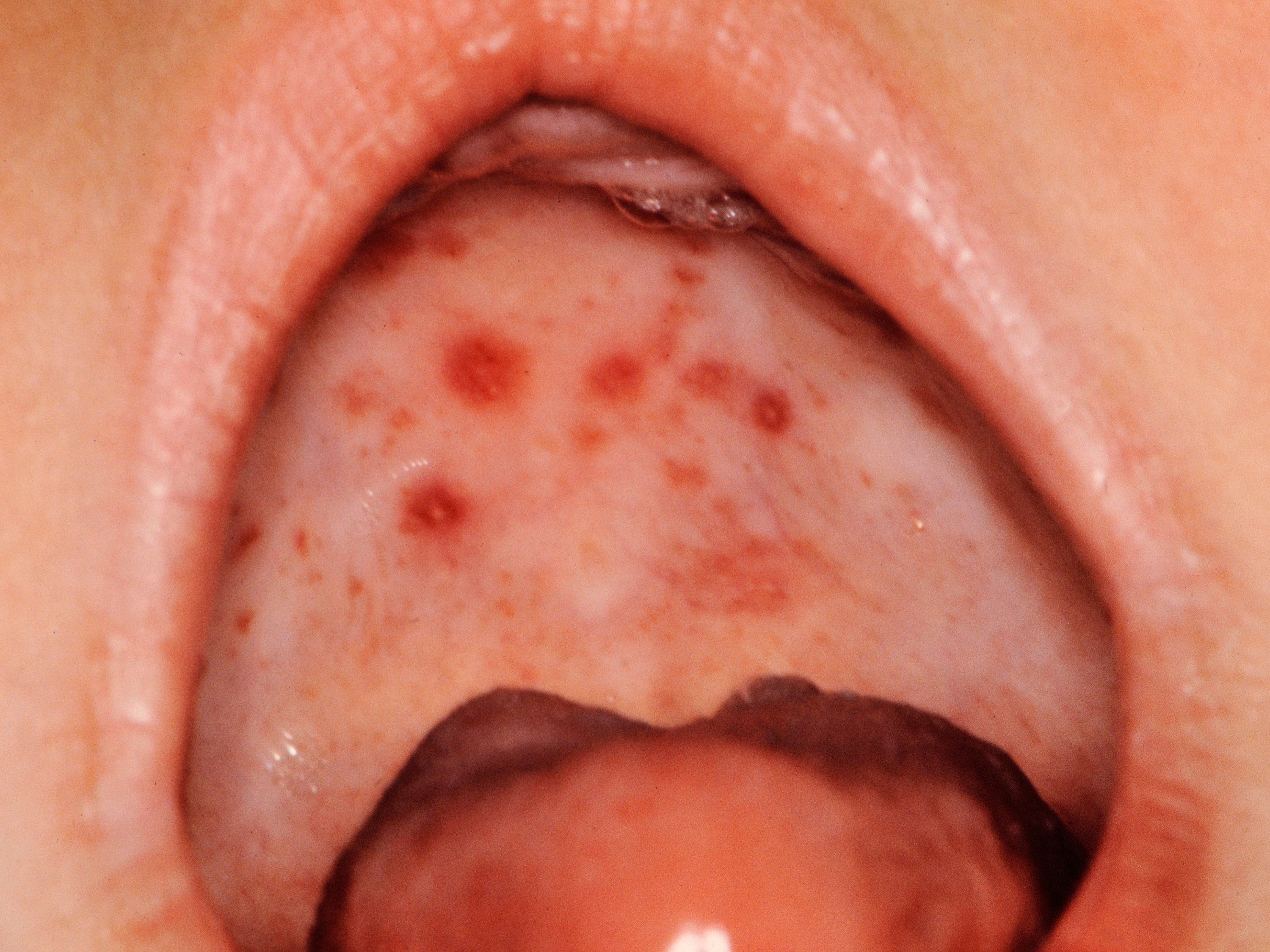 tong en wang -mucosa). Later (bij 2/3 van patiënten) een exantheem van kleine,