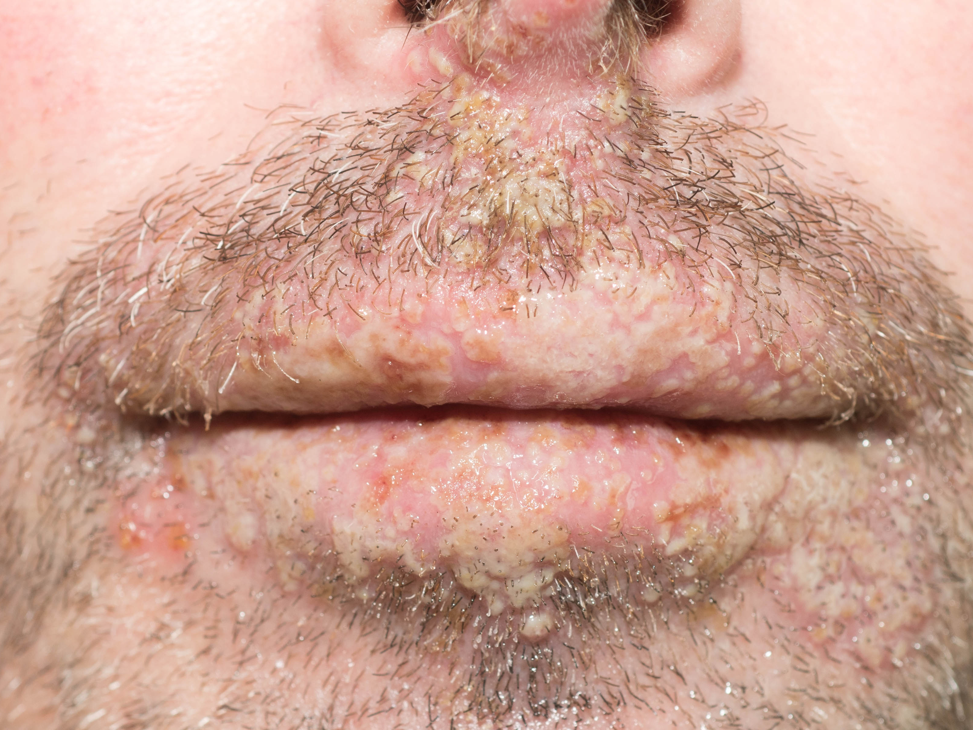 een recidief treedt op de rand van de lip op, bij zo'n 30-50% van de dragers.