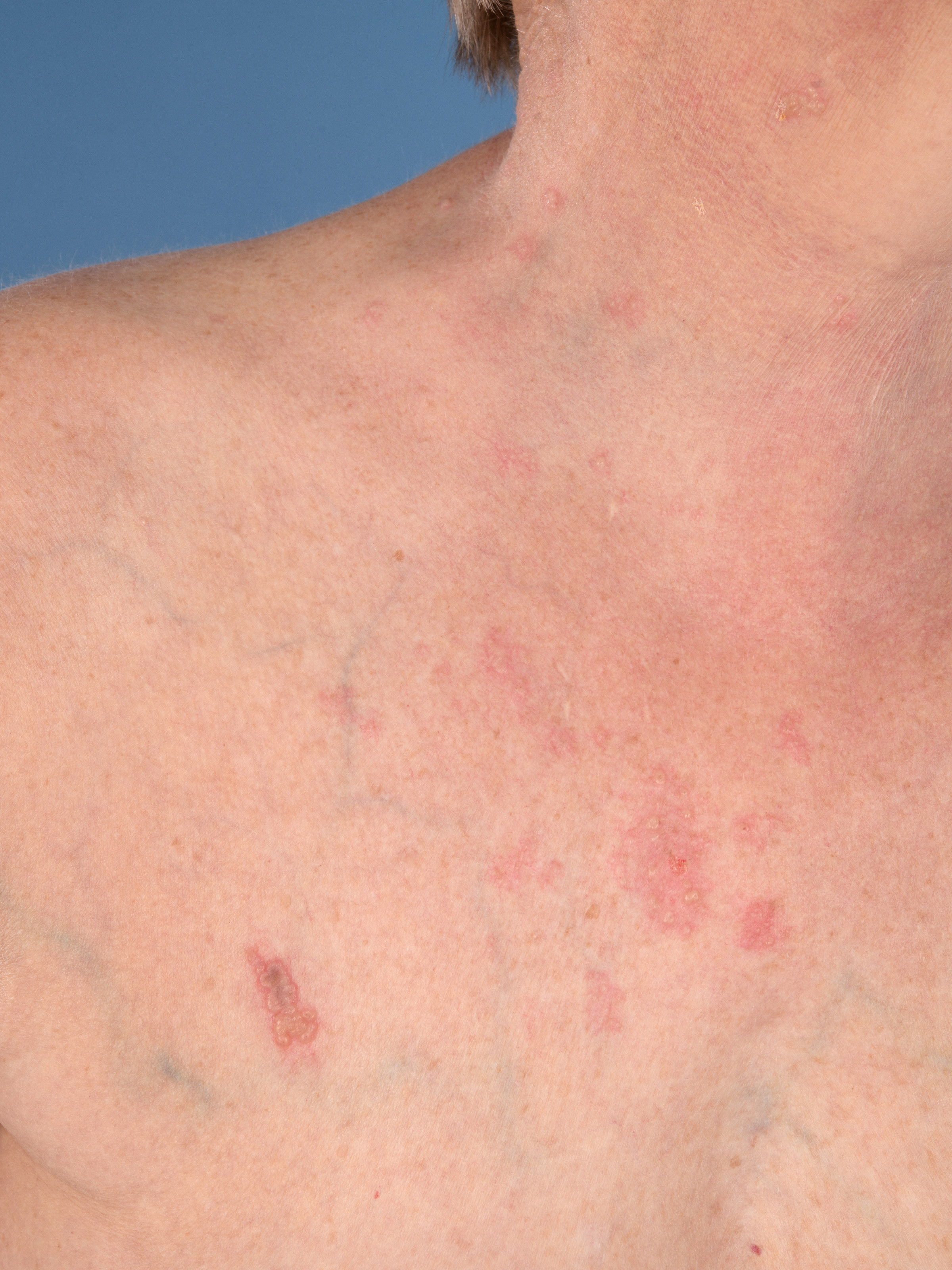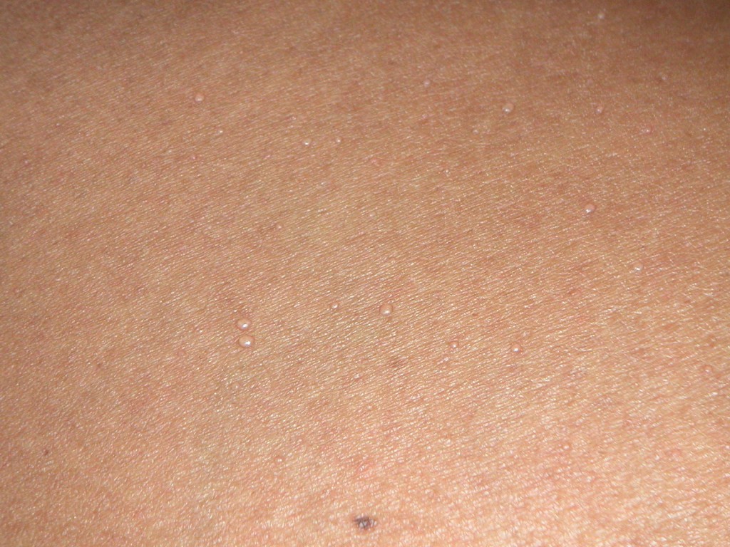 vesikels die als dauwdruppels op de huid liggen, verspreid over gehele lichaam.