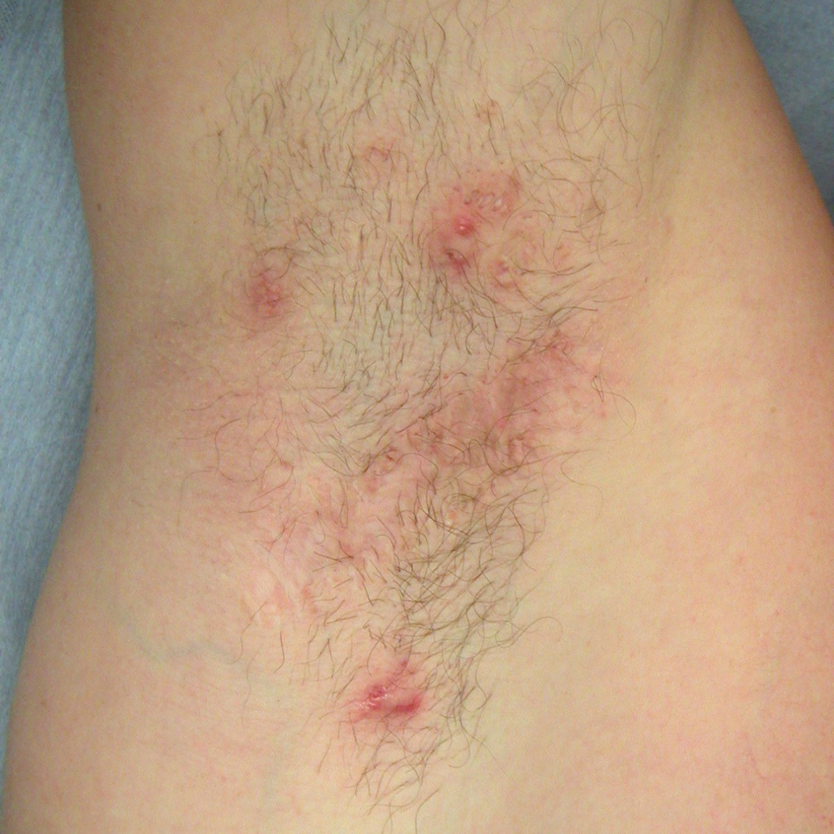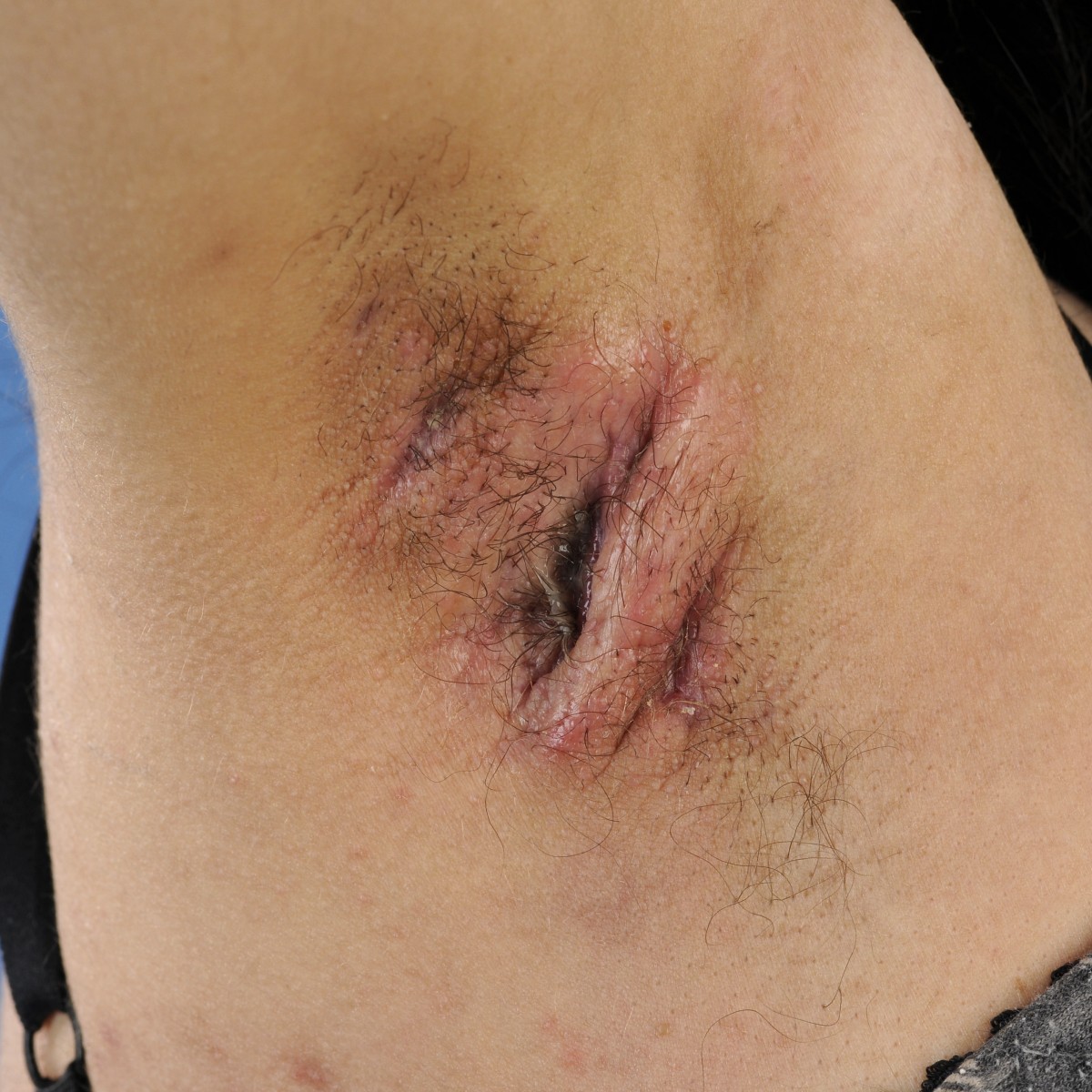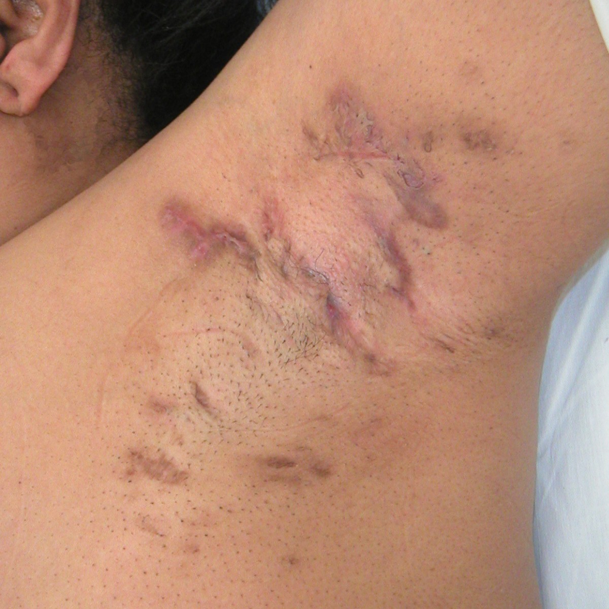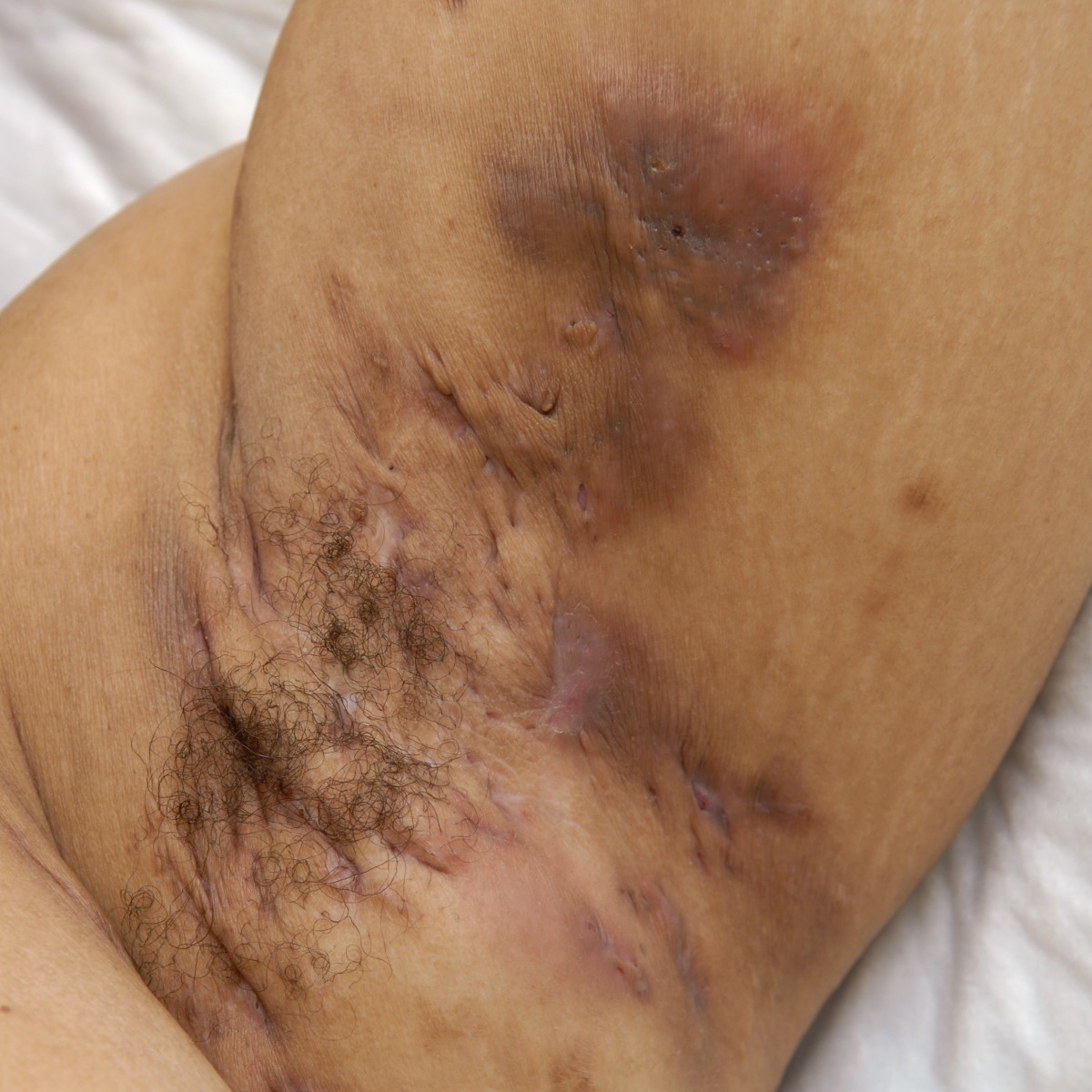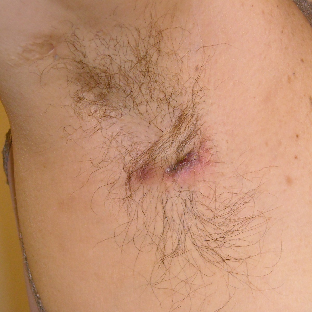 tussen) Hurley II moet ik er uitsnijden want als er fistels zijn of abcessen die steeds op dezelfde plek terugkomen is opereren het enige wat helpt. En het kan want er zit gezonde huid omheen. |