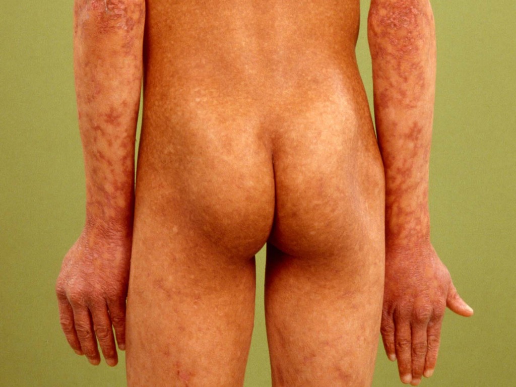 alleen bij Aziaten, eerst jeukende papels, daarna hyperpigmentatie,