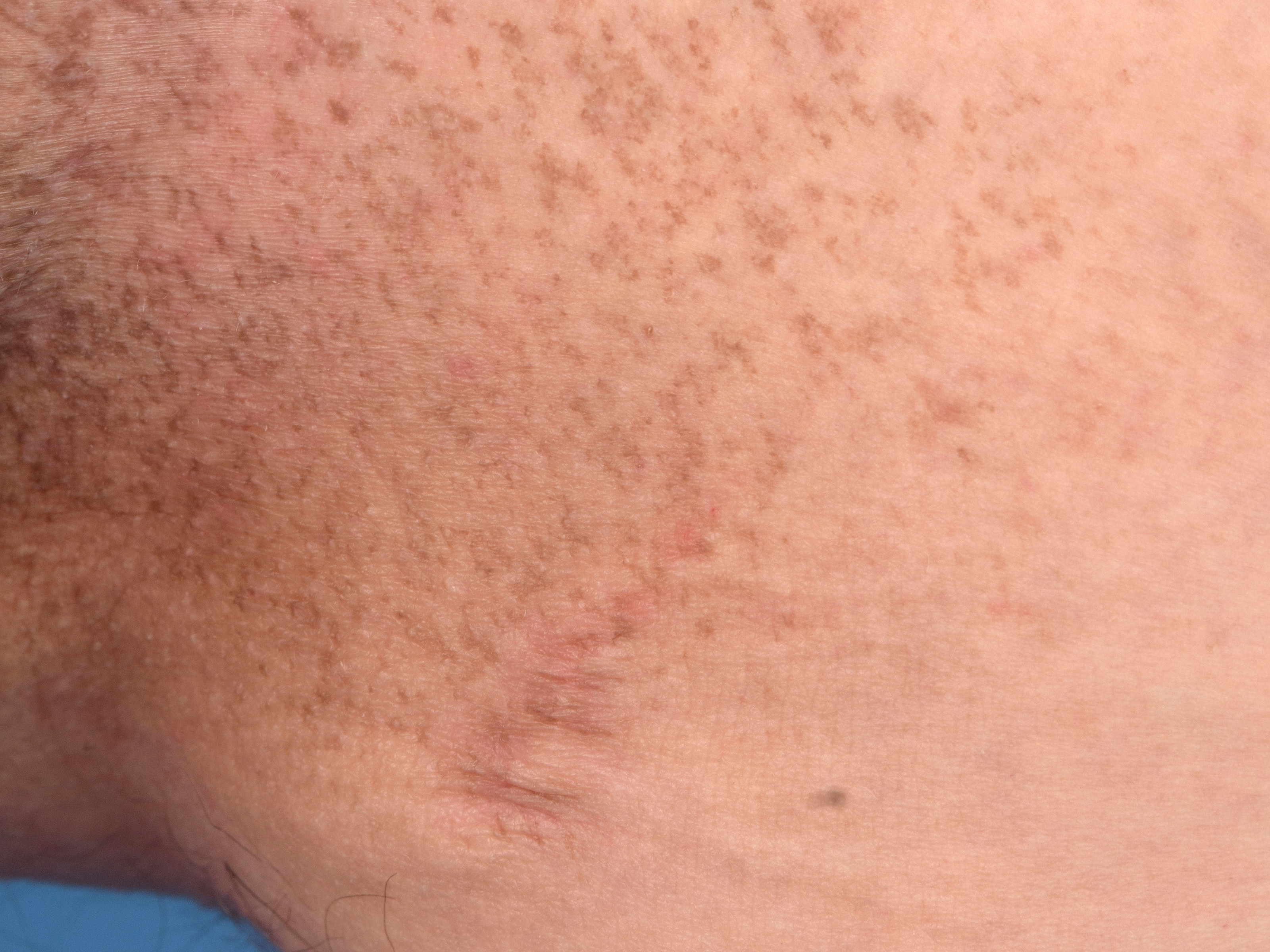 post-inflammatoire hyperpigmentatie, of door secundaire amyloid