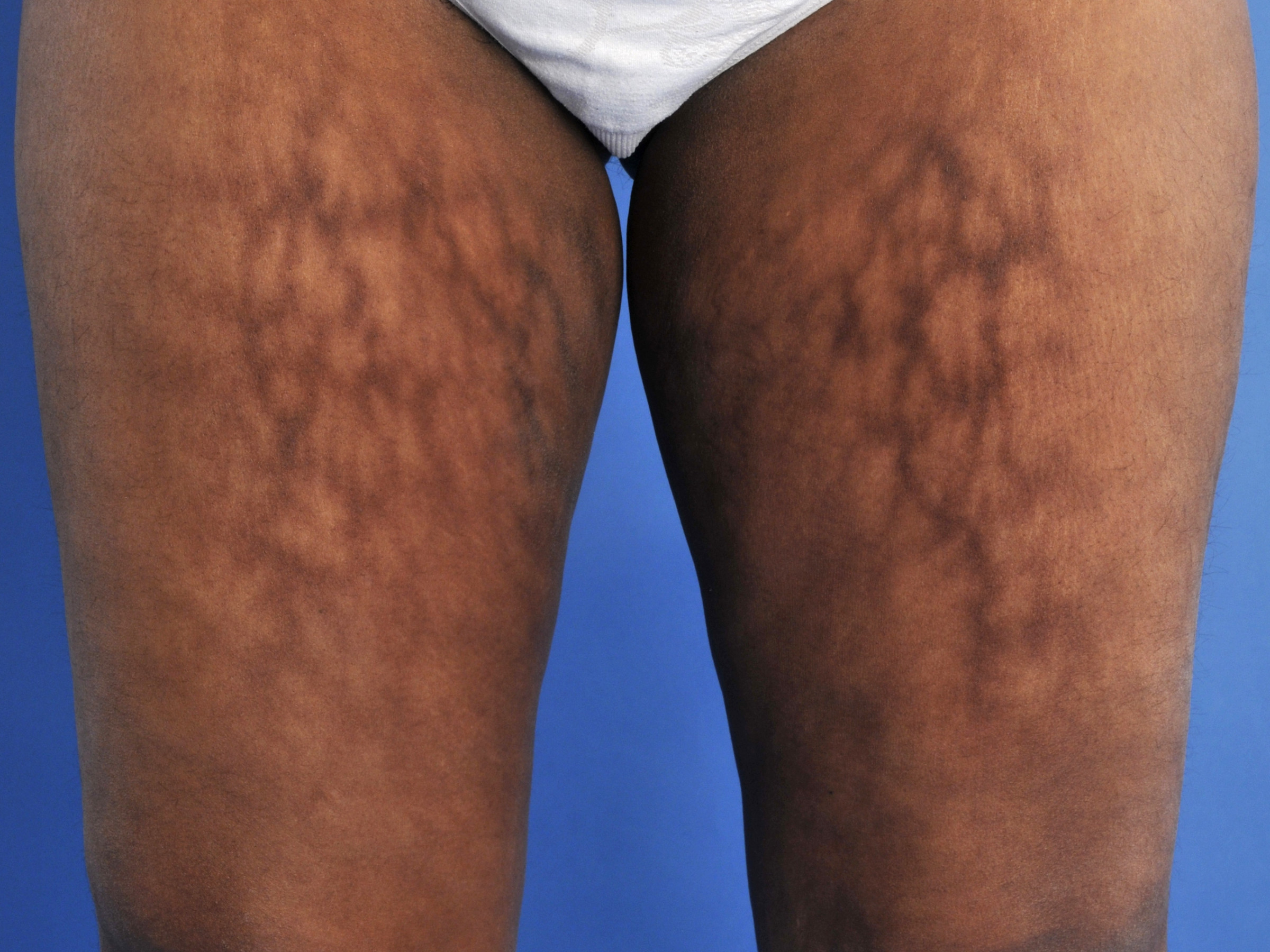 dunne en verminderde beharing, reticulaire pigmentatie van de huid,