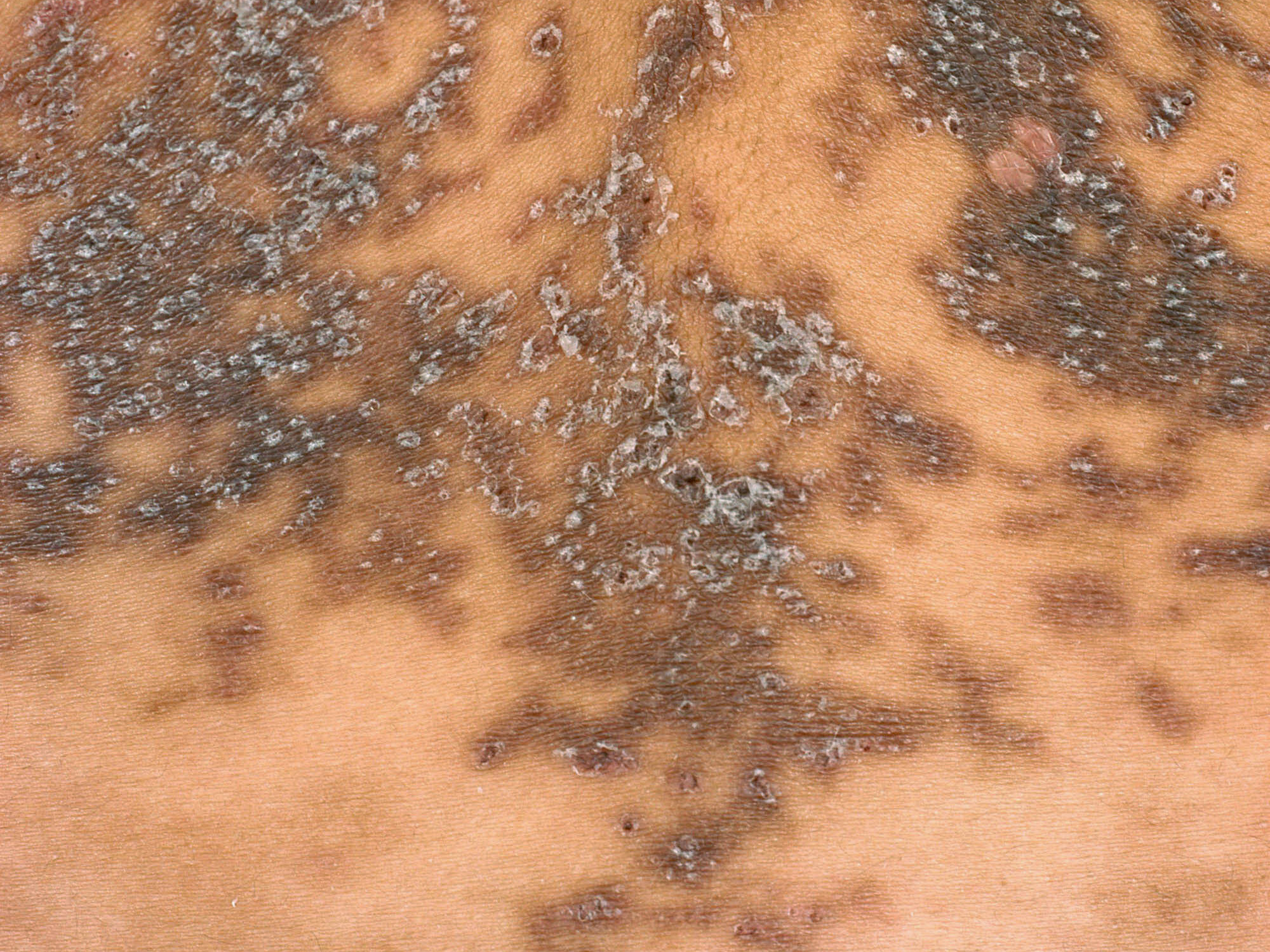 verheven, schilferend, vooral op het bovenlichaam (borst) en